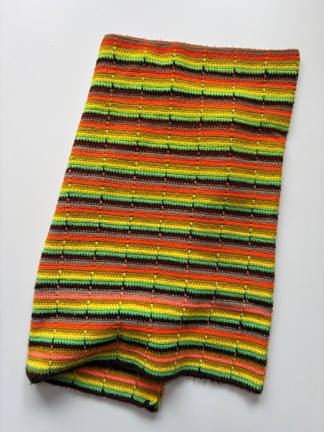 1970s hand made in USA 素材 : Acrylic × Wool size : タテ 190 cm × ヨコ 95 cm アメリカにて買付け 致しました ハンドメイドのニットラグです。 このてのアイテムの中でも比較的 しっかりと編まれているので 重みがあり、カバーやブランケットはもちろん 敷物としてもご利用いただけます。 目立った汚れやダメージはなく 綺麗な状態です。