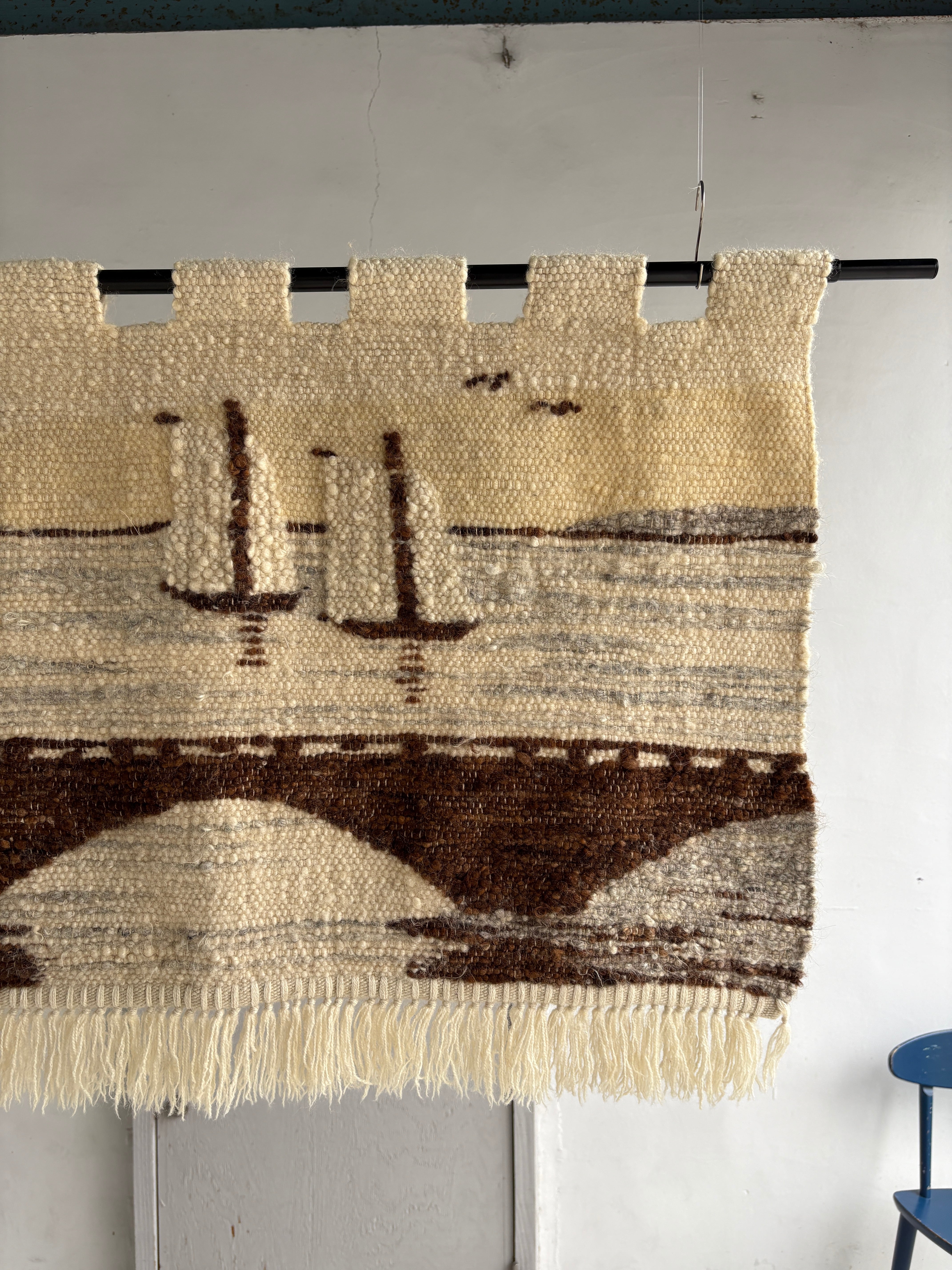 同時期のアメリカのタペストリーに比べて 繊細なデザインと素材の柔らかさが魅力的で サイズも大きめなので 空間の主役として さりげなく存在感をだしてくれるので お勧めです。