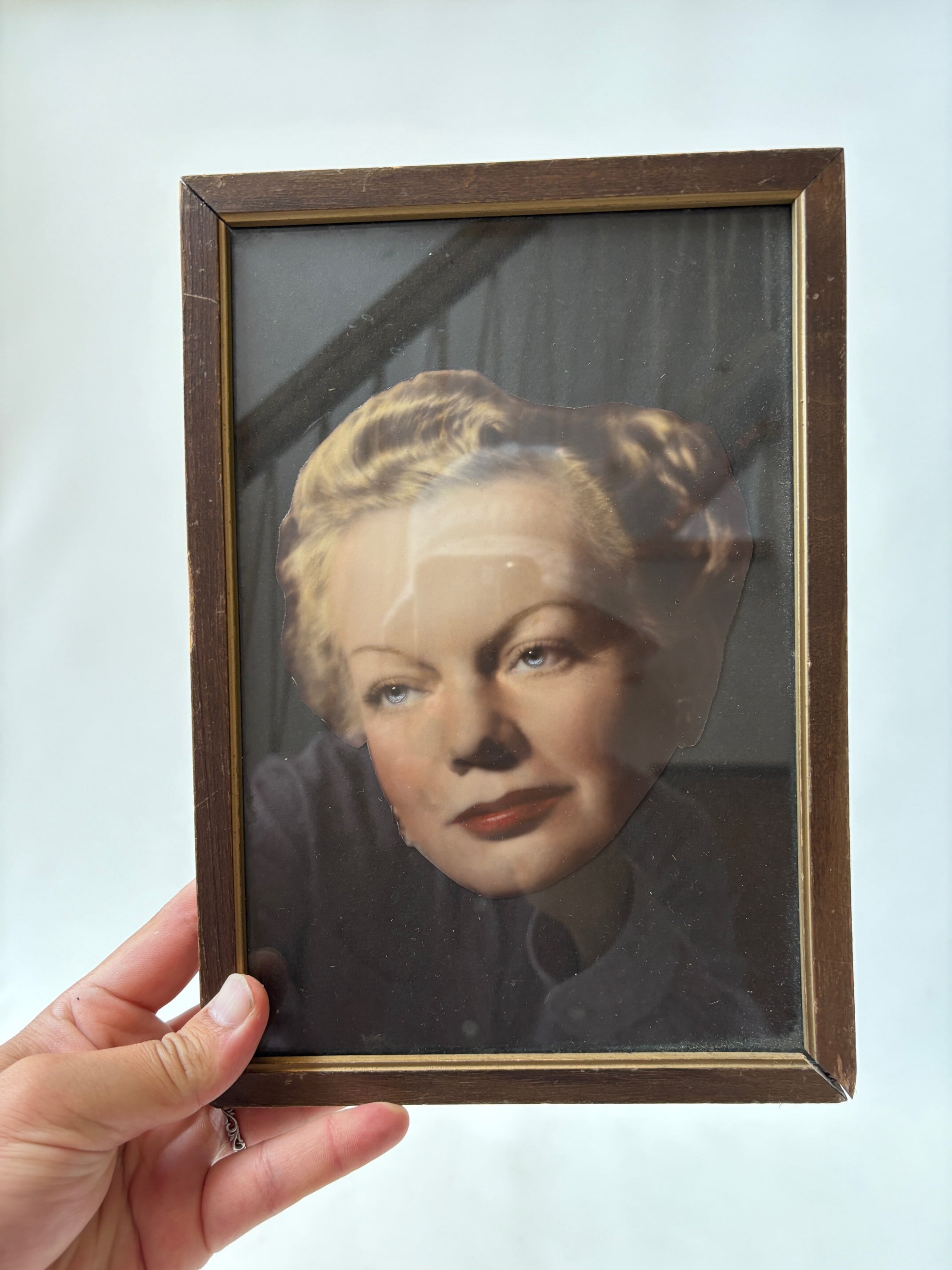 切り取られた女性の顔が額装されています、このまま飾っていただいても 中身を入れ替えてもご利用いただけます。