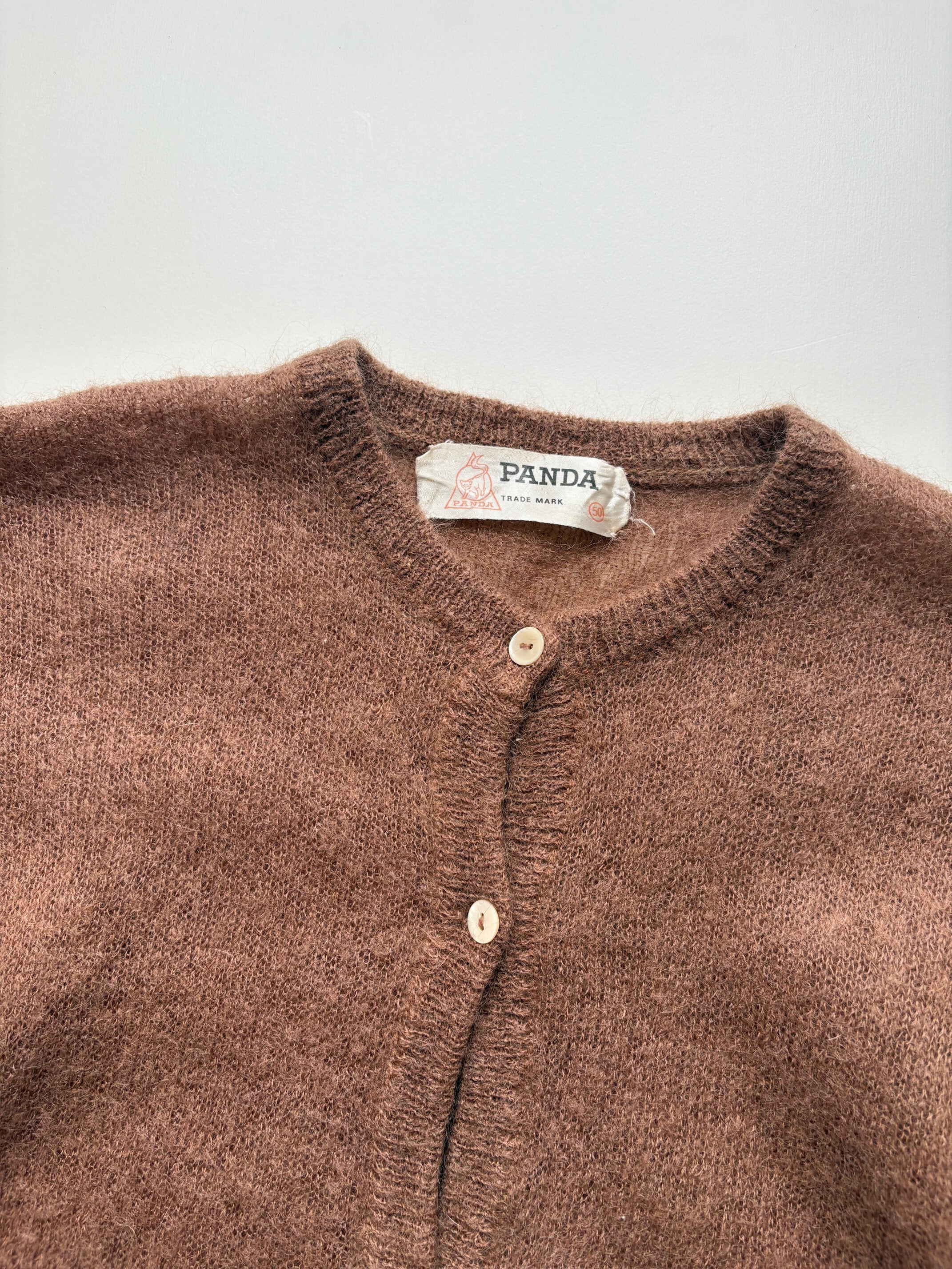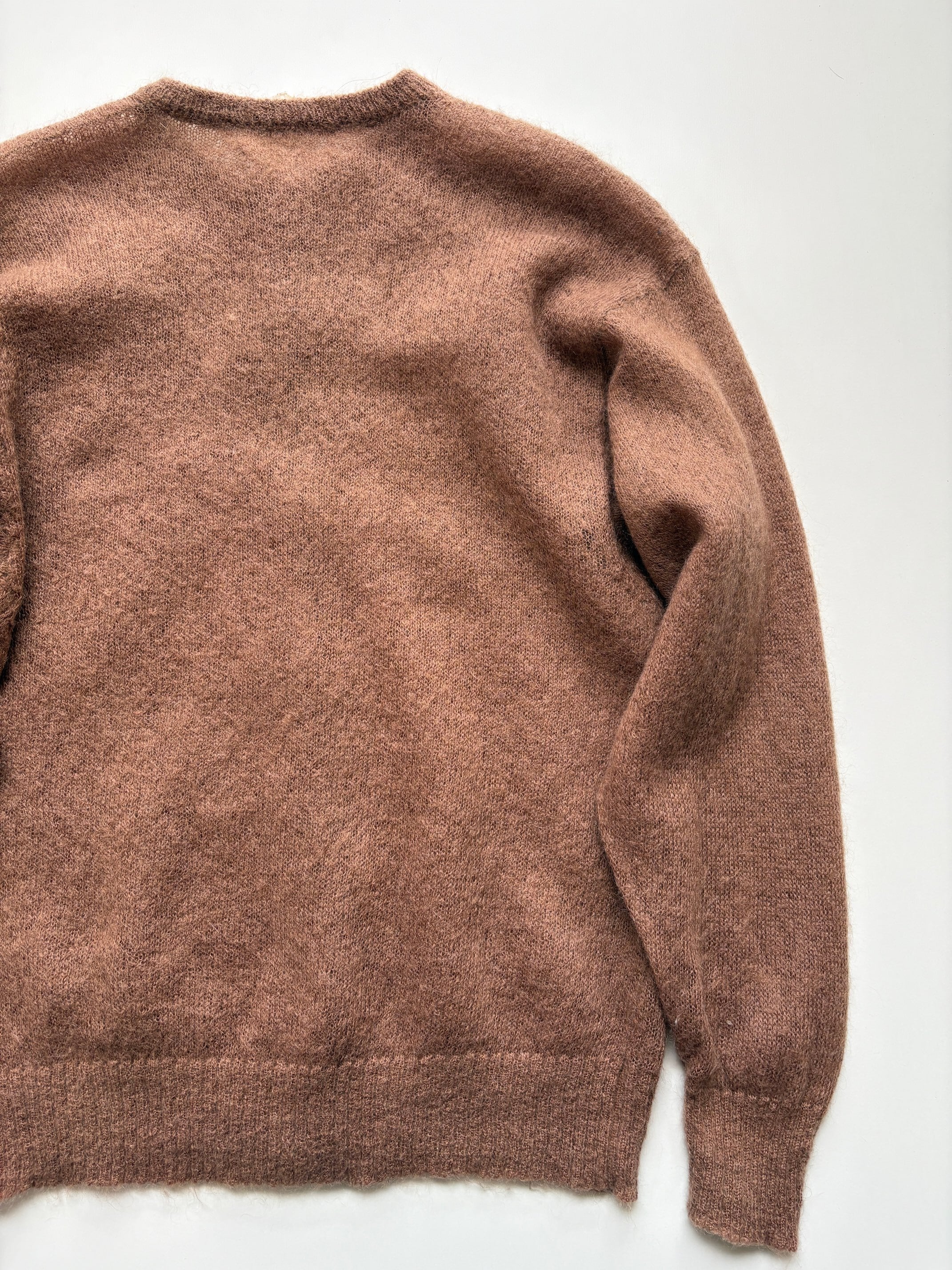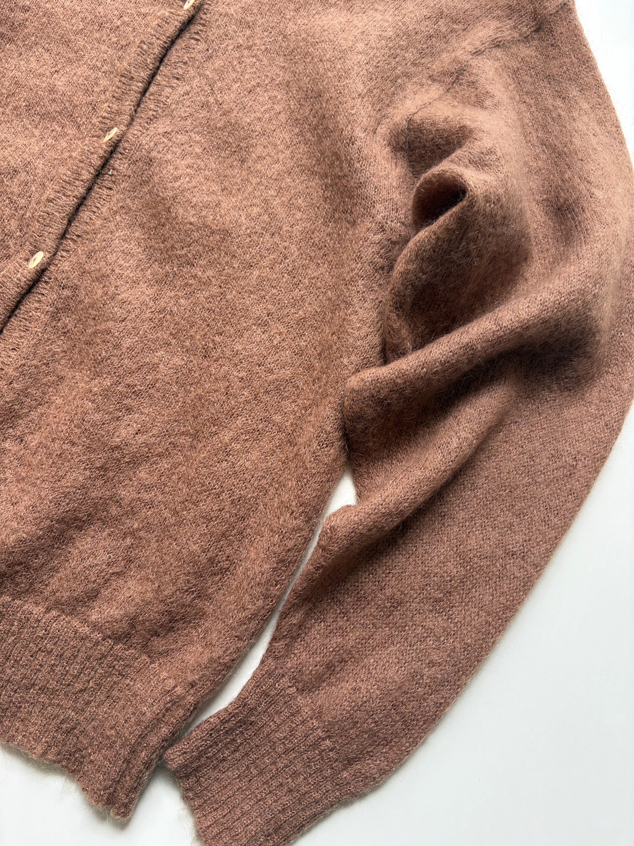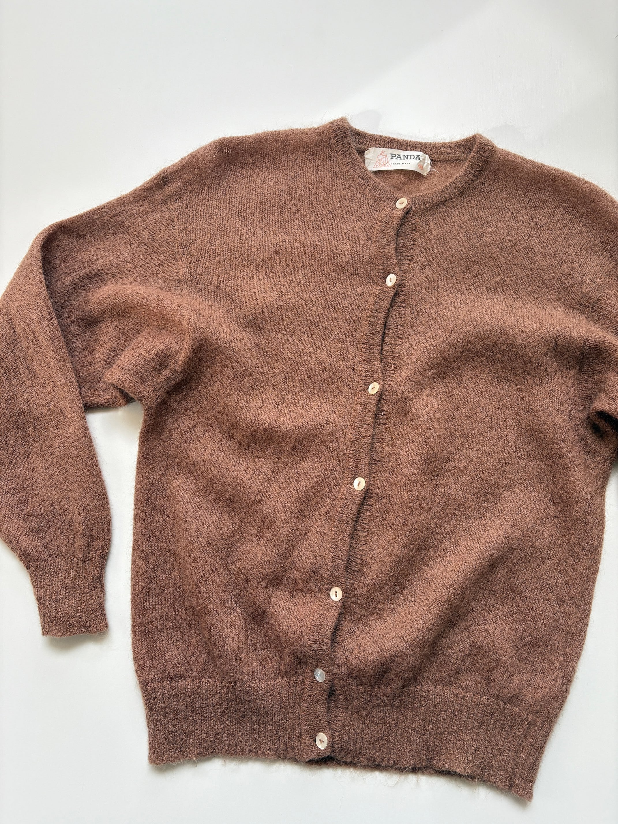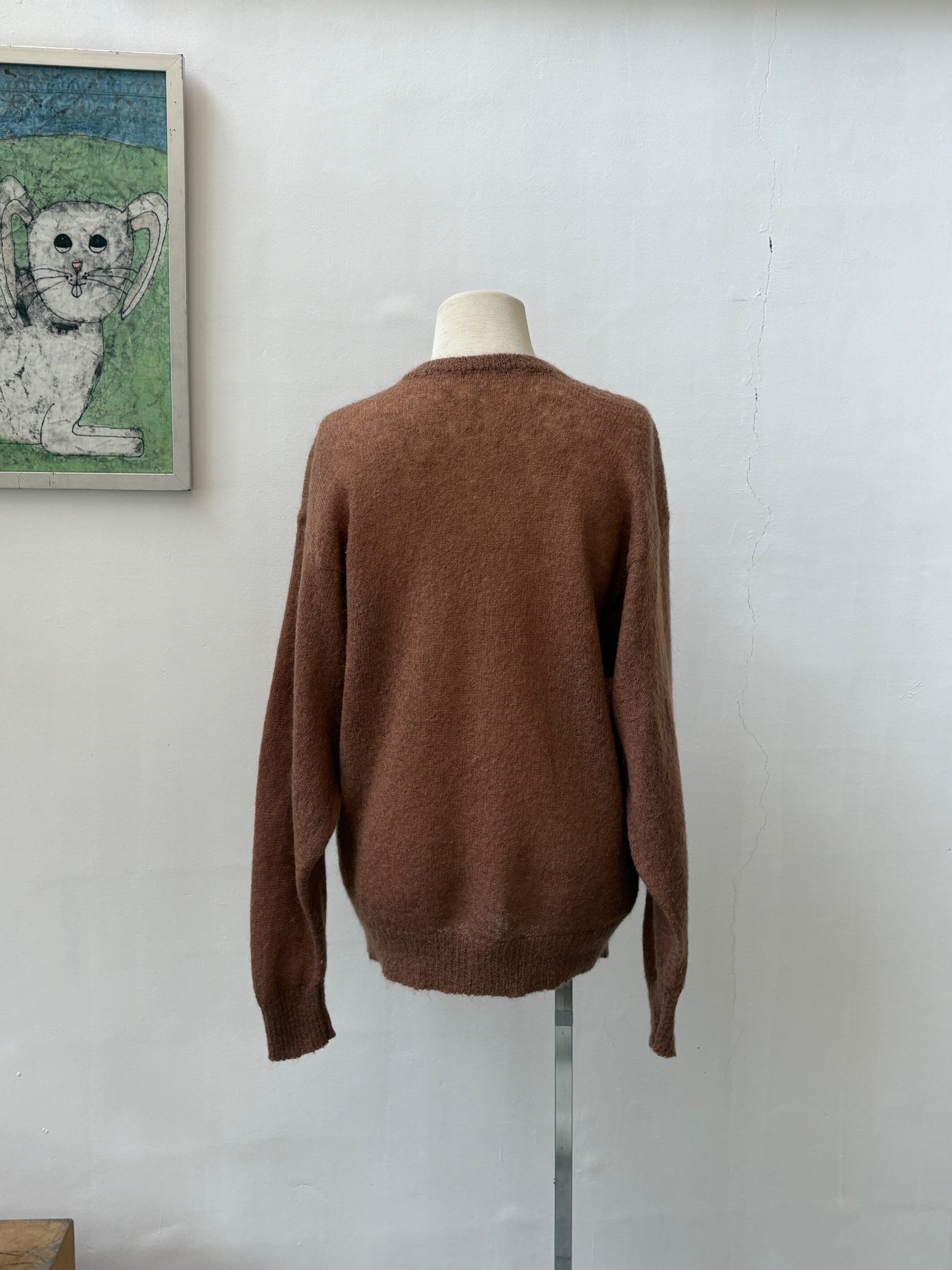 アメリカのオールドモヘアと違い 薄手でふわっと軽い着心地、毛足は短く 首元までボタンがあるのが特徴です。