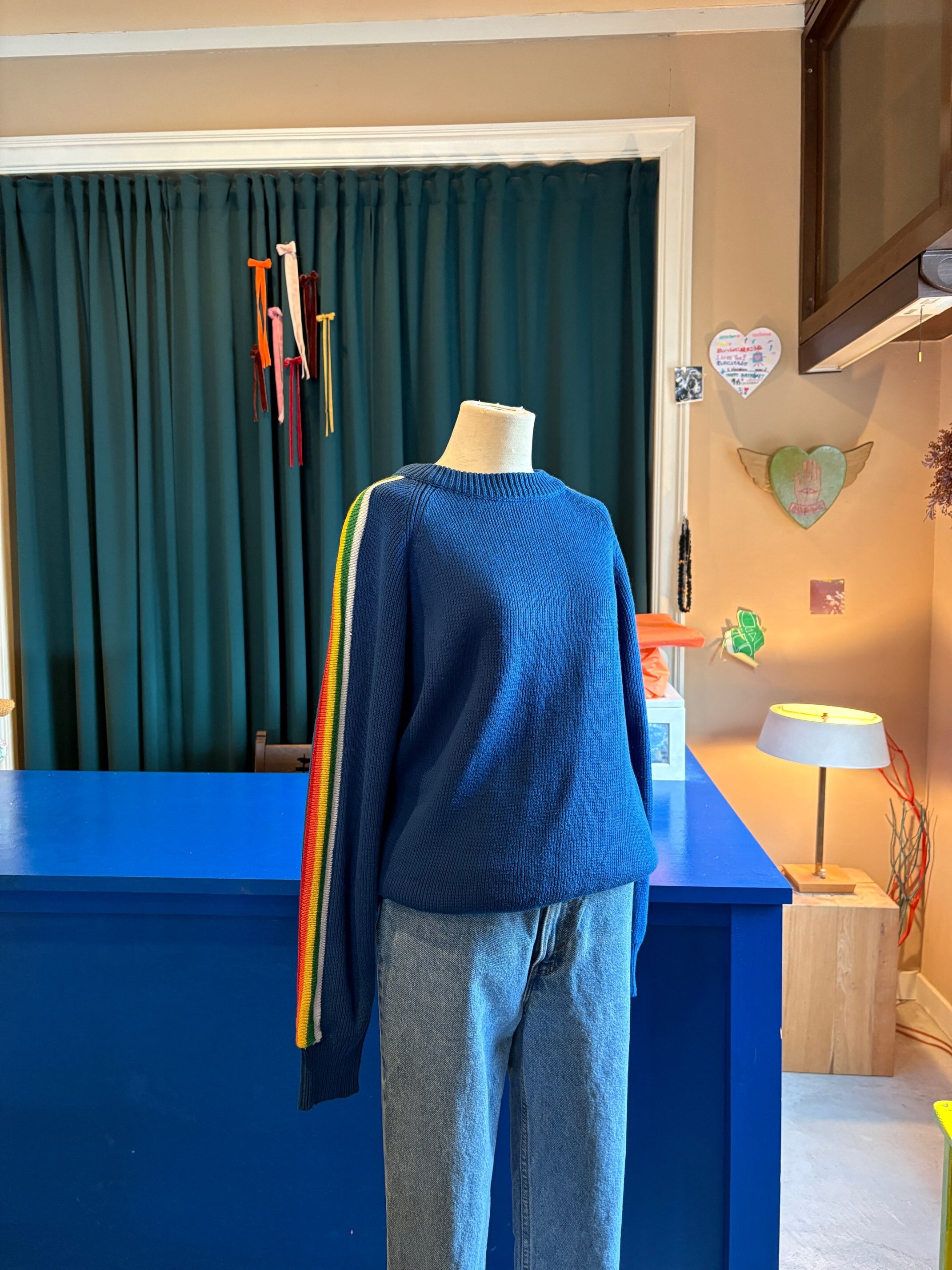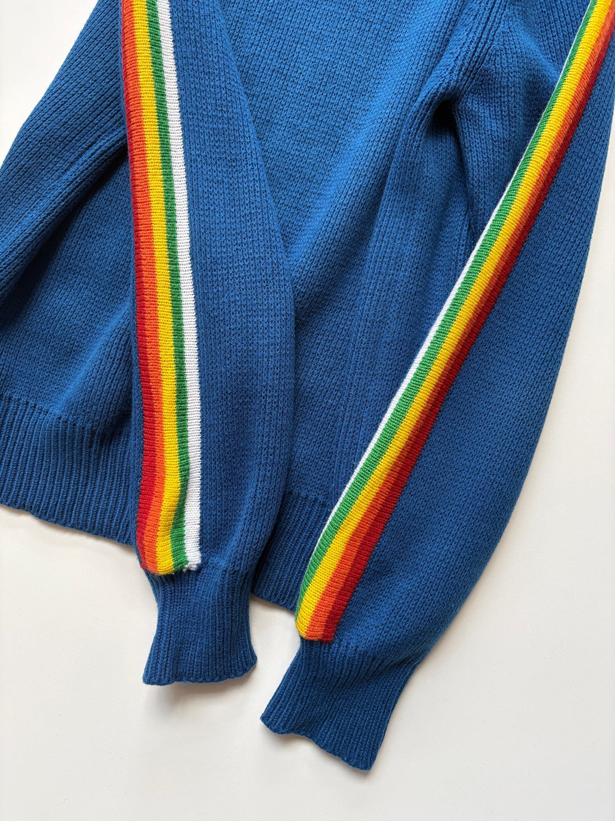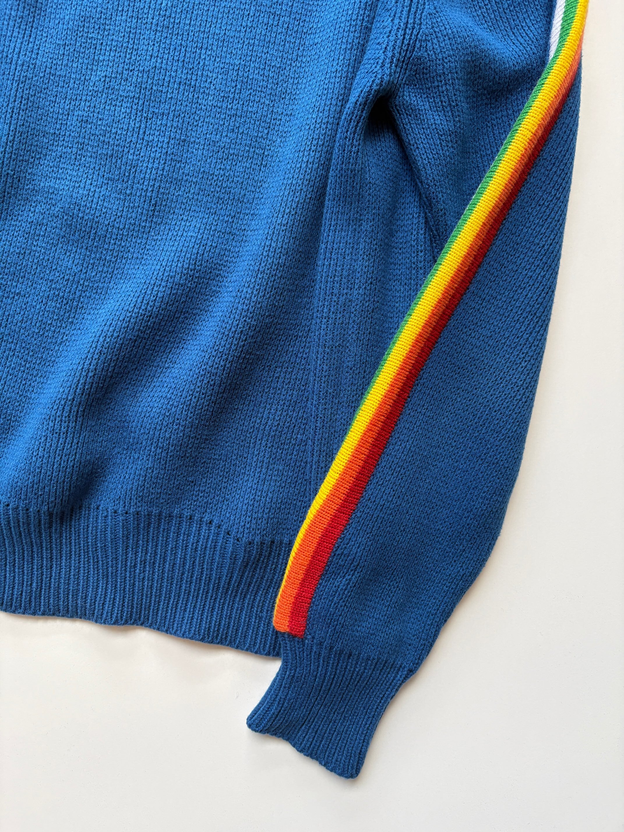 綺麗な深いブルーと袖の虹が ユニークで魅力的な1着です。