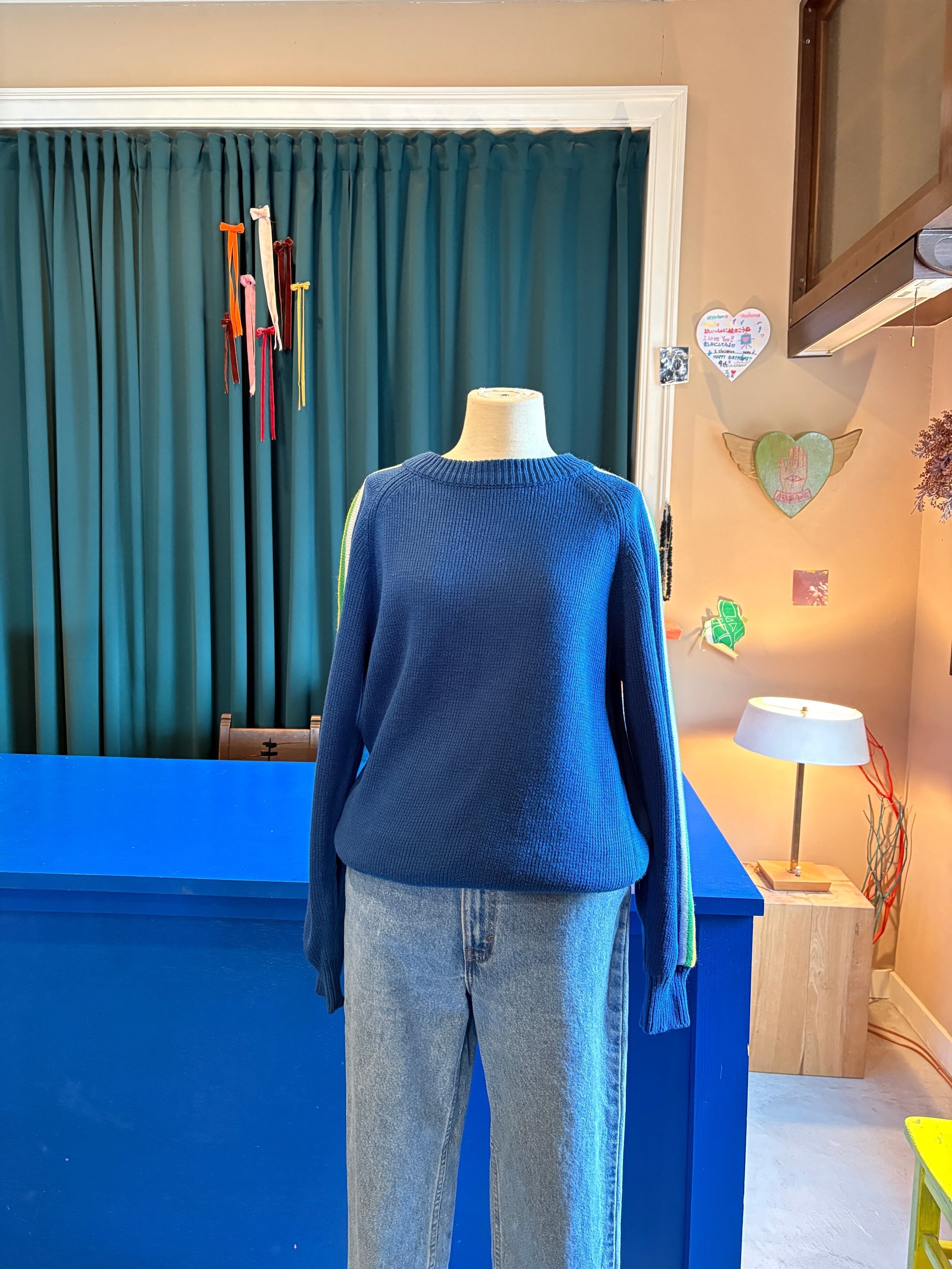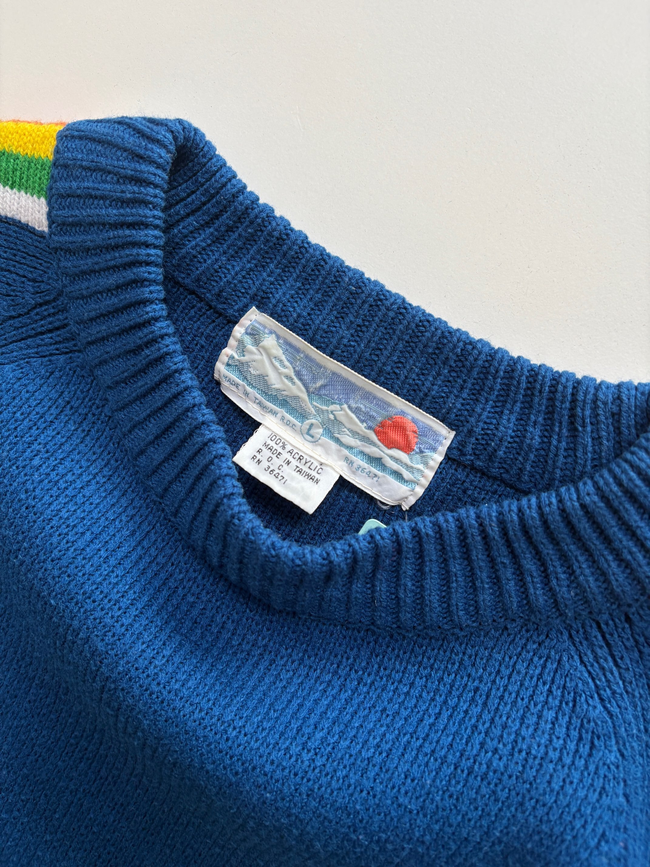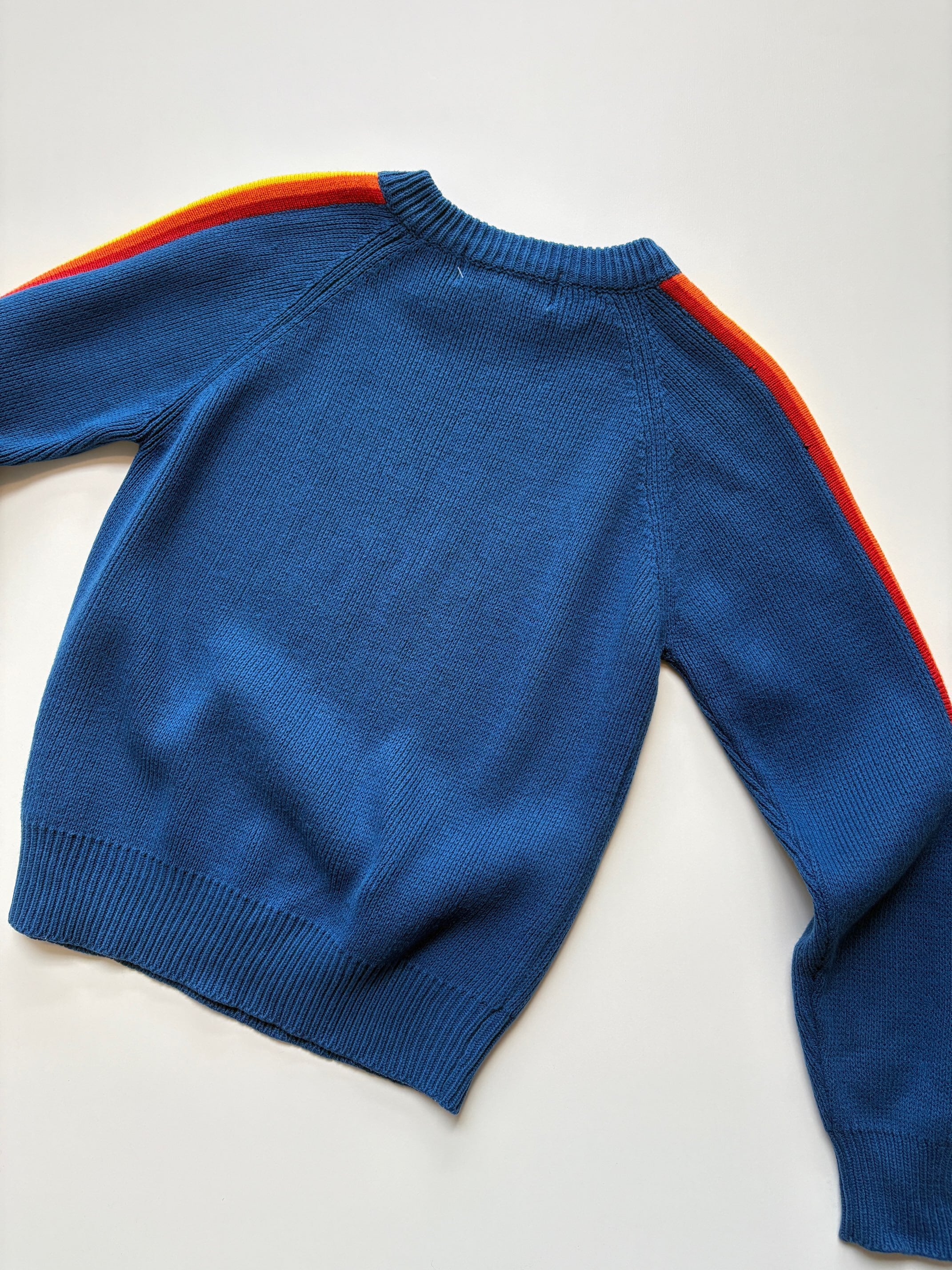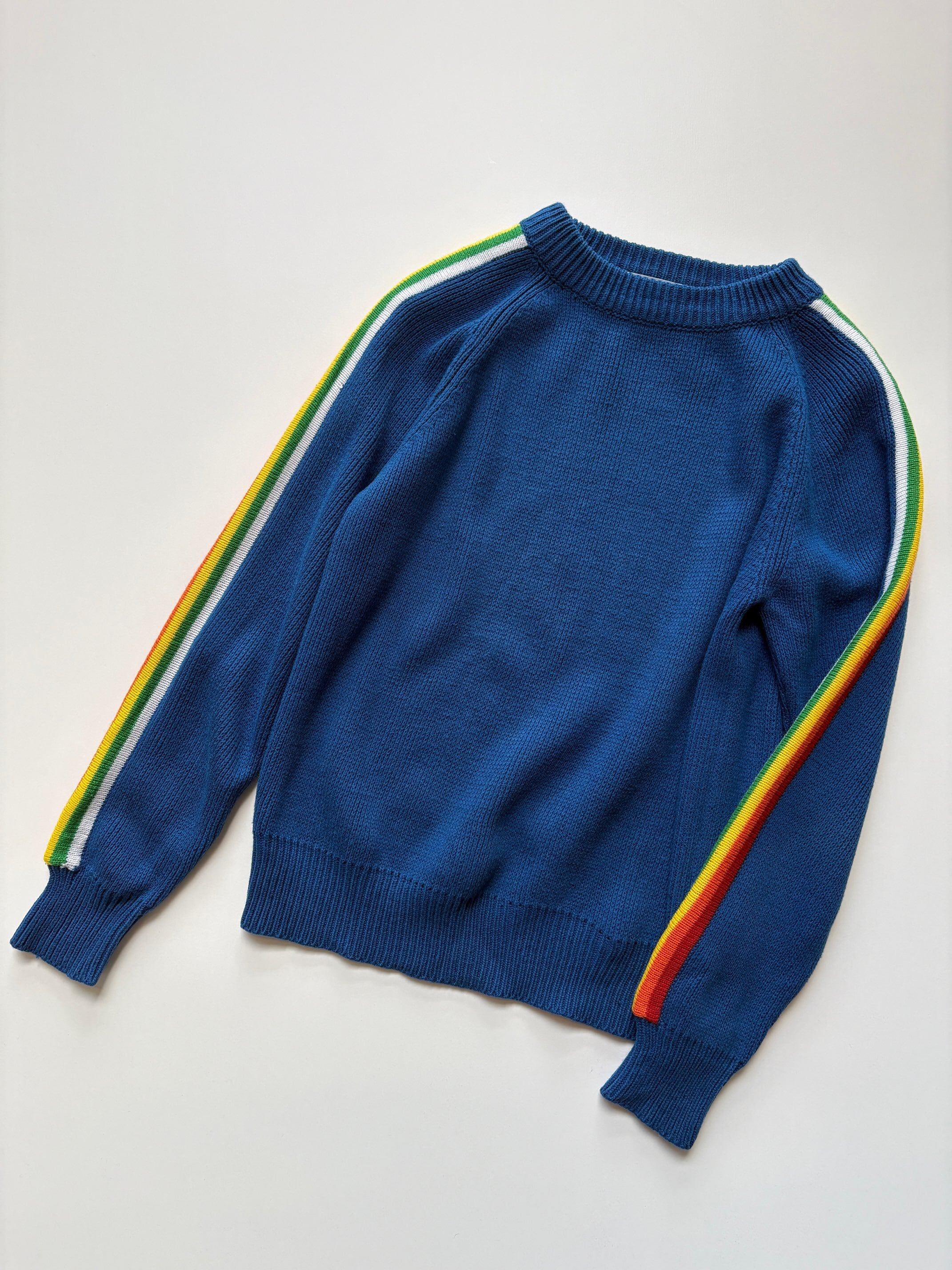綺麗な深いブルーと袖の虹が ユニークで魅力的な1着です。
