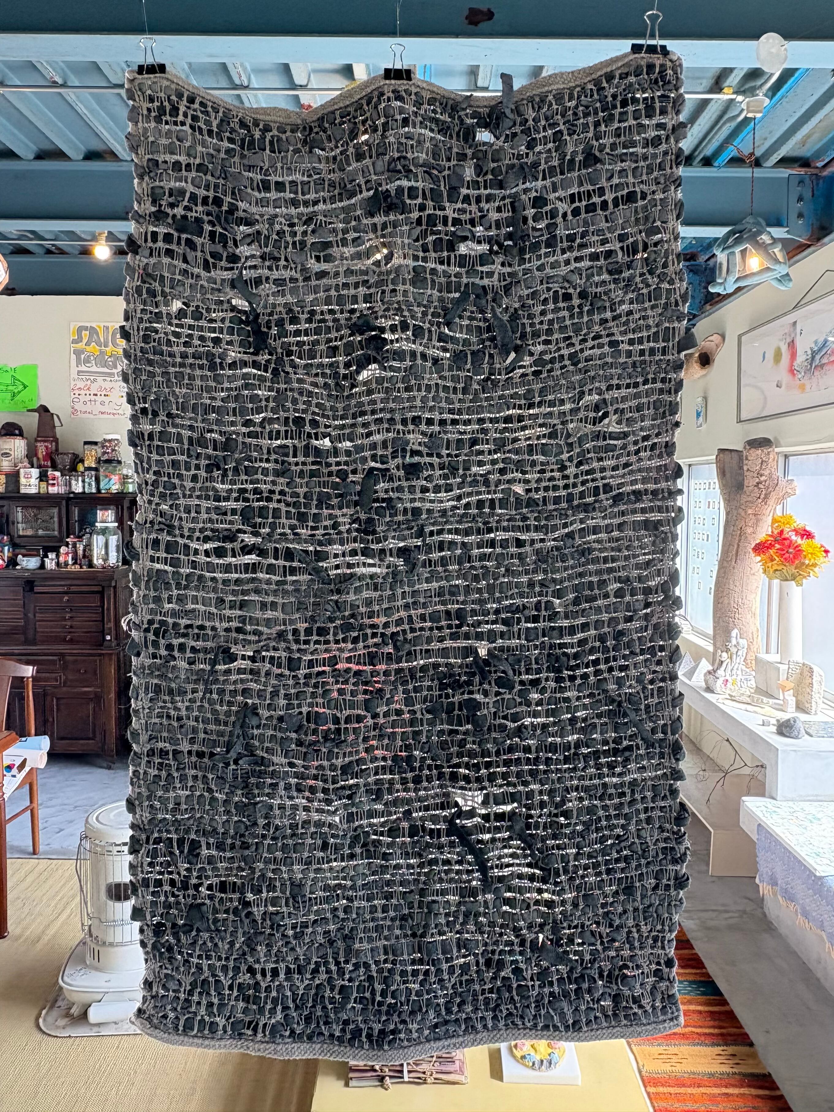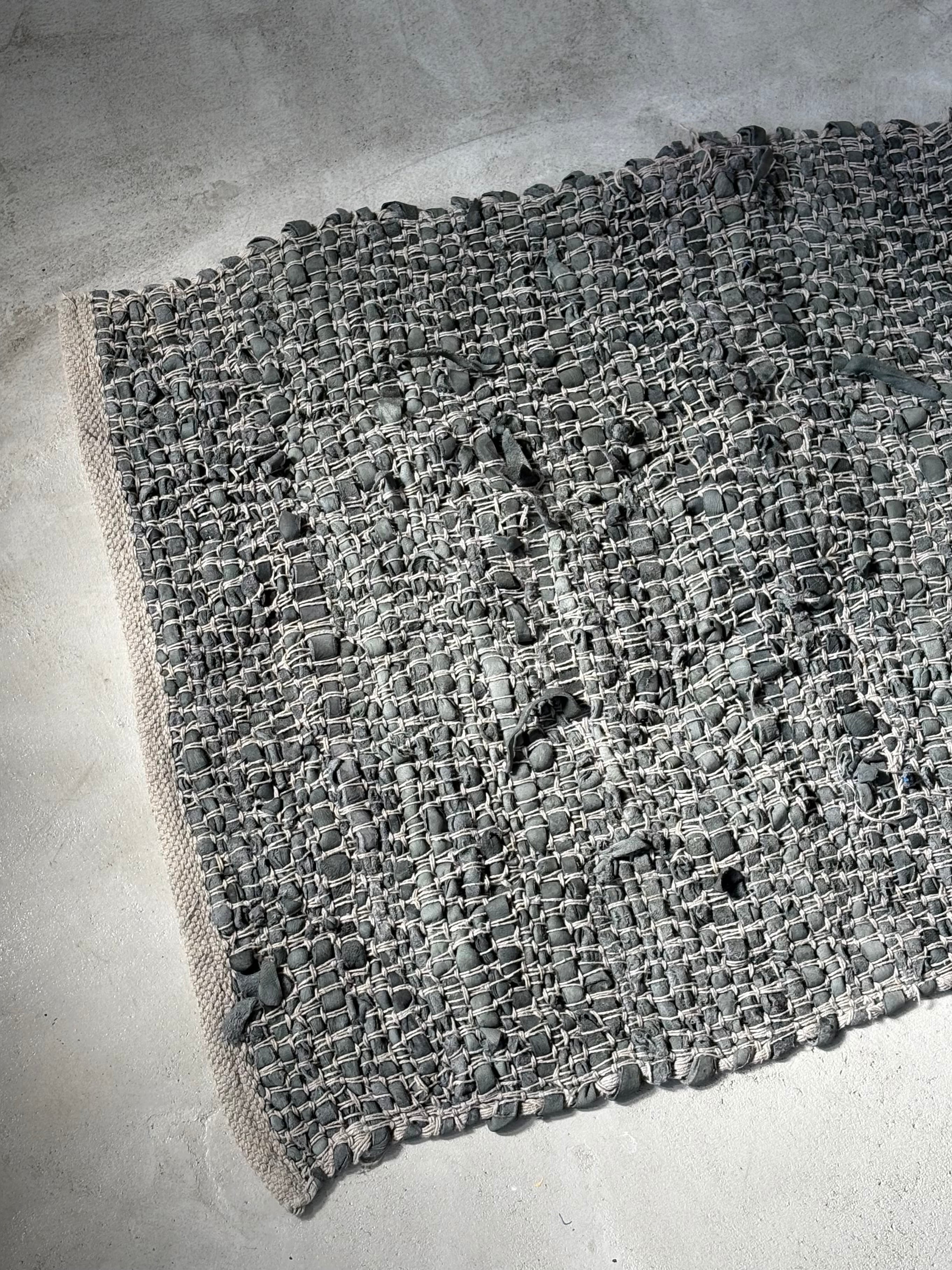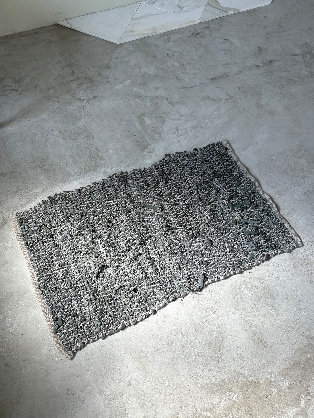 商品説明 : レザーやスエードのハギレを使って丁寧に編み込んだユニークな敷物です。