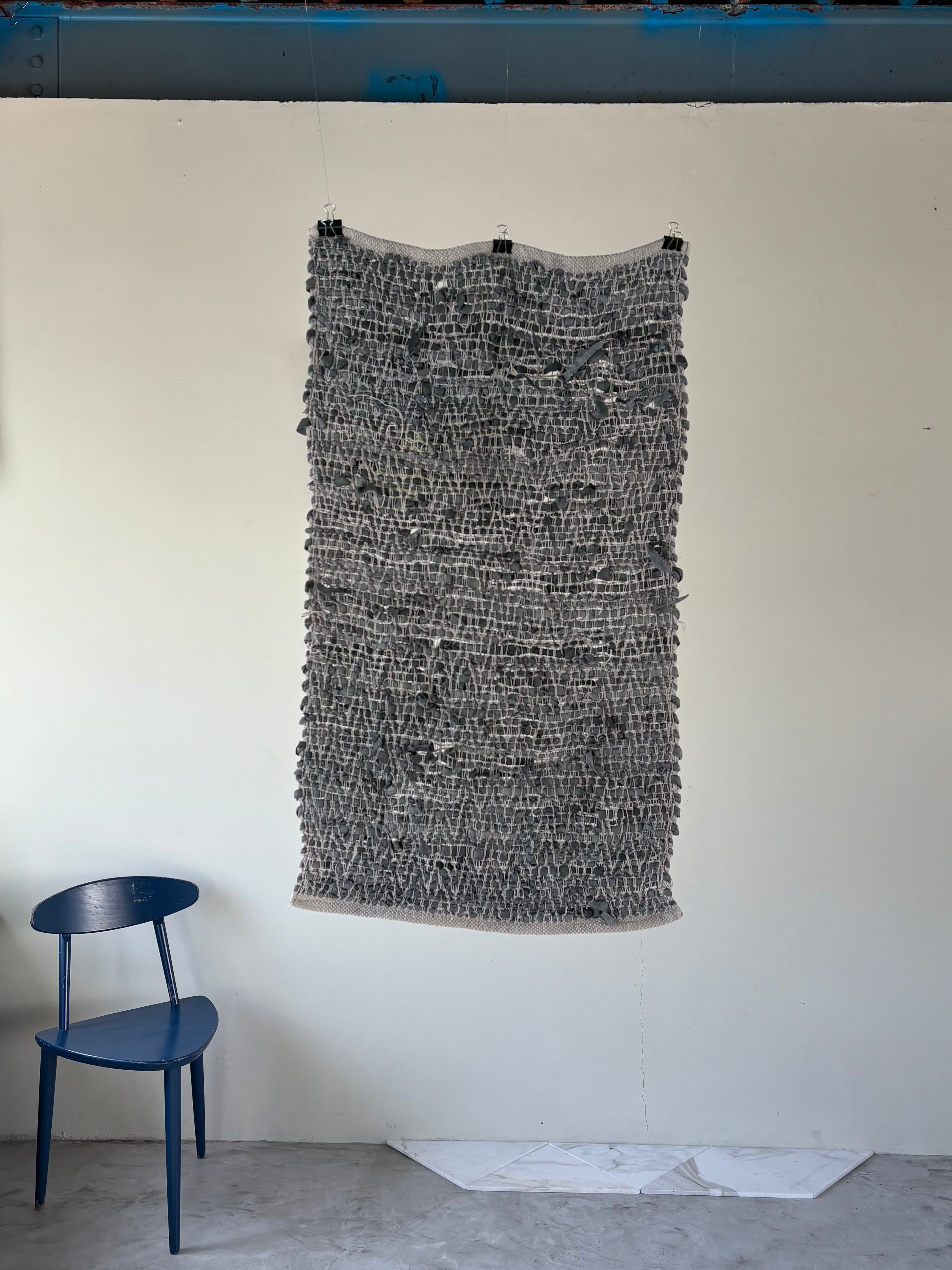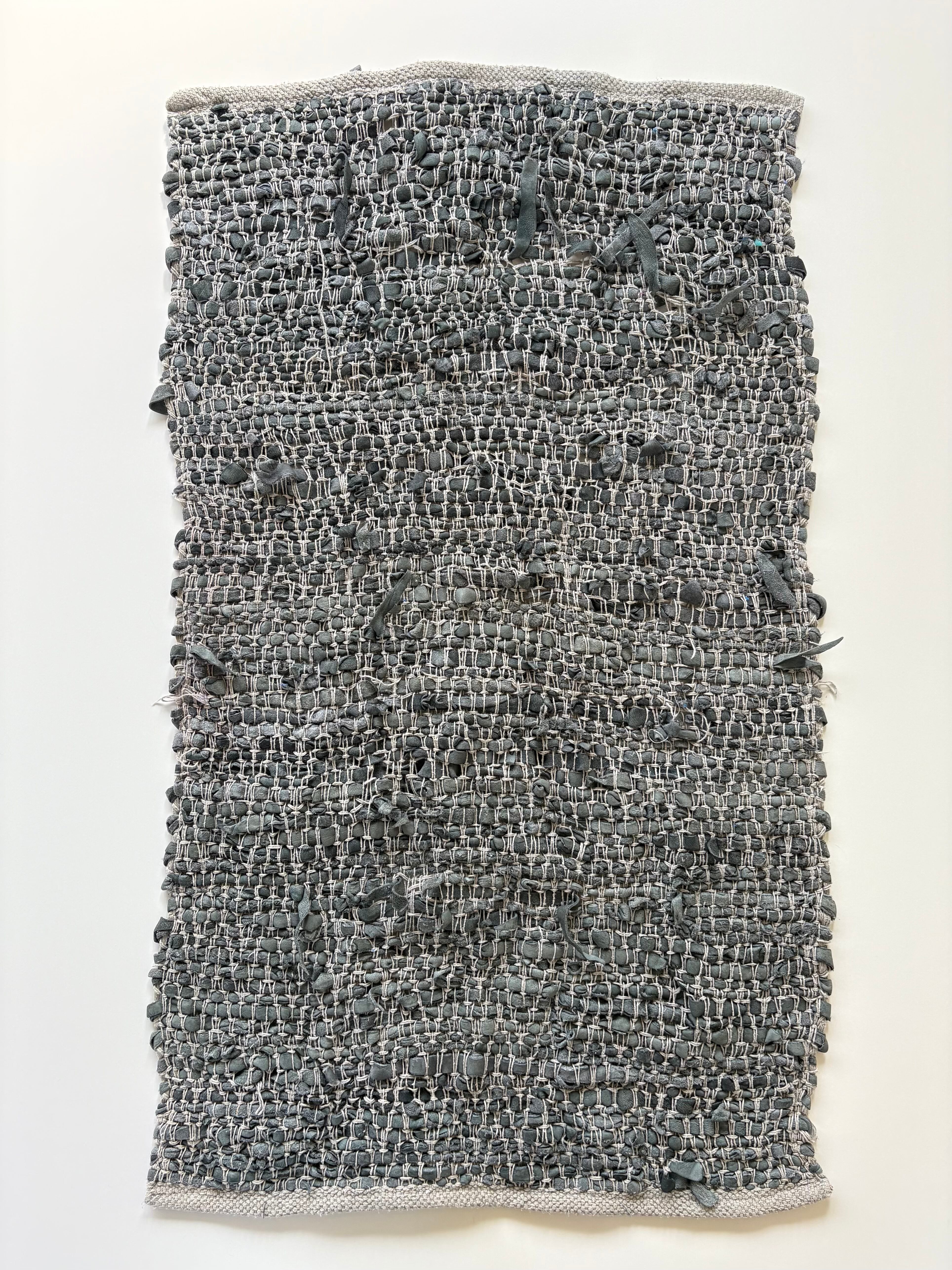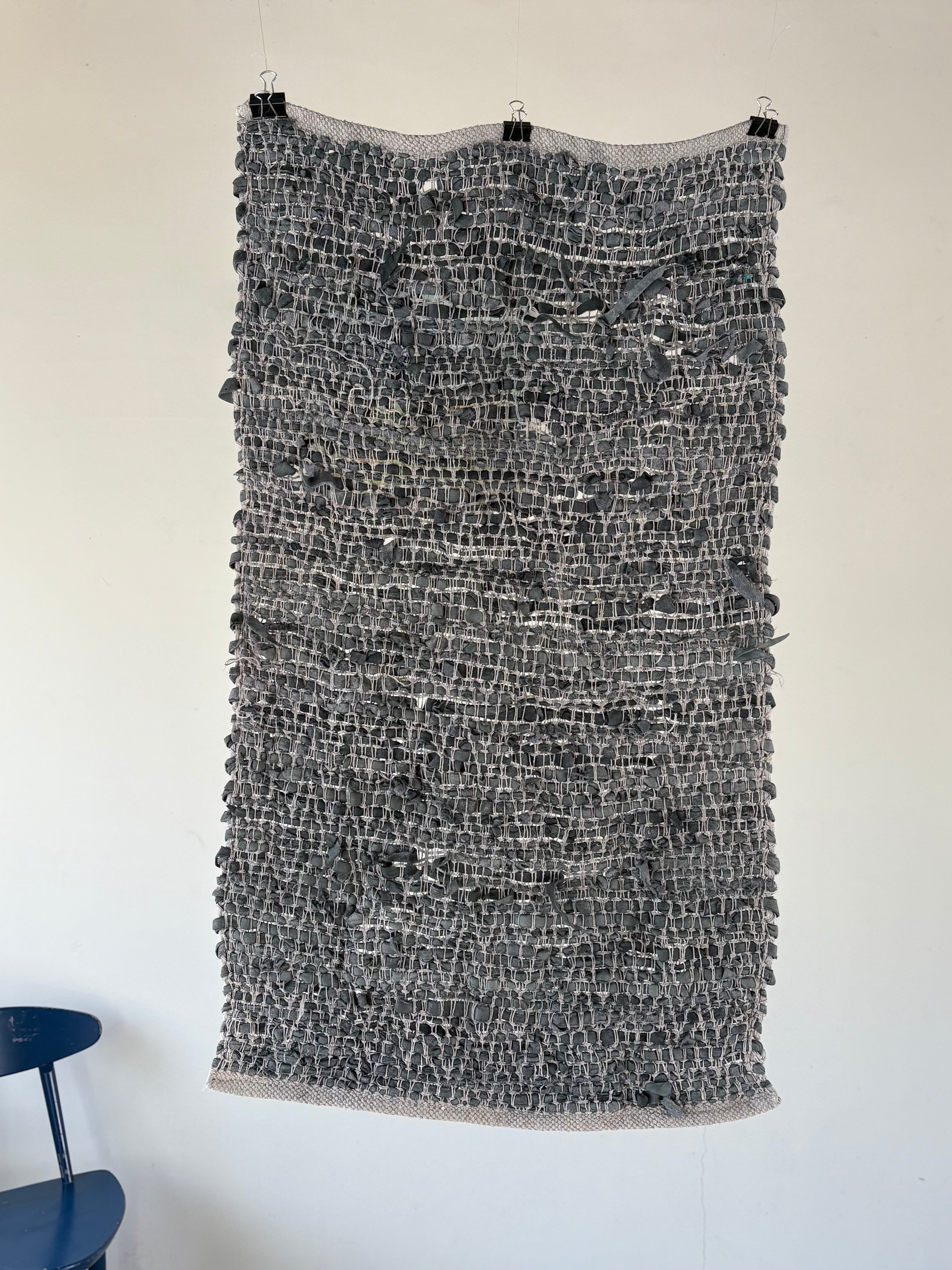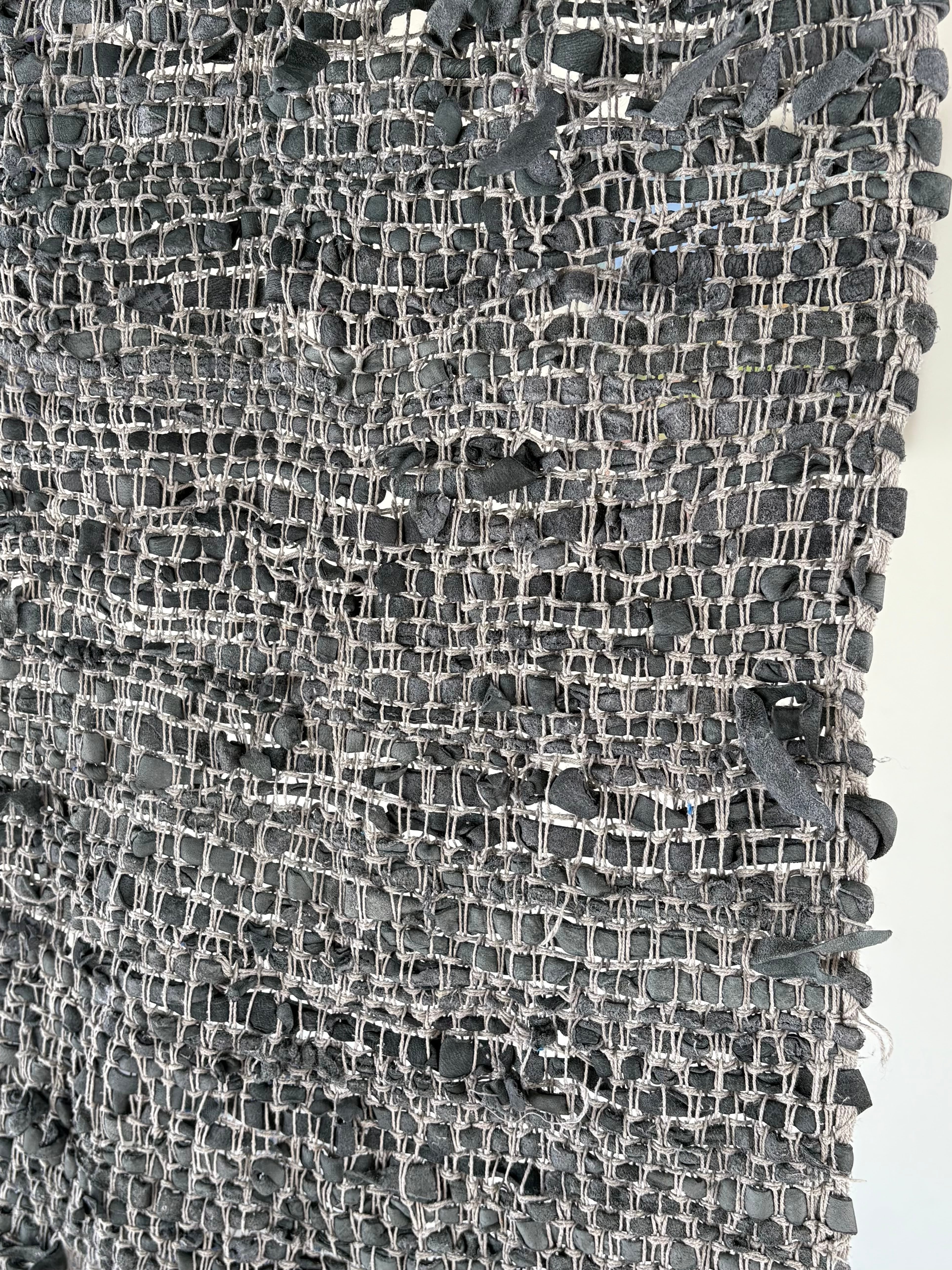 商品説明 : レザーやスエードのハギレを使って丁寧に編み込んだユニークな敷物です。