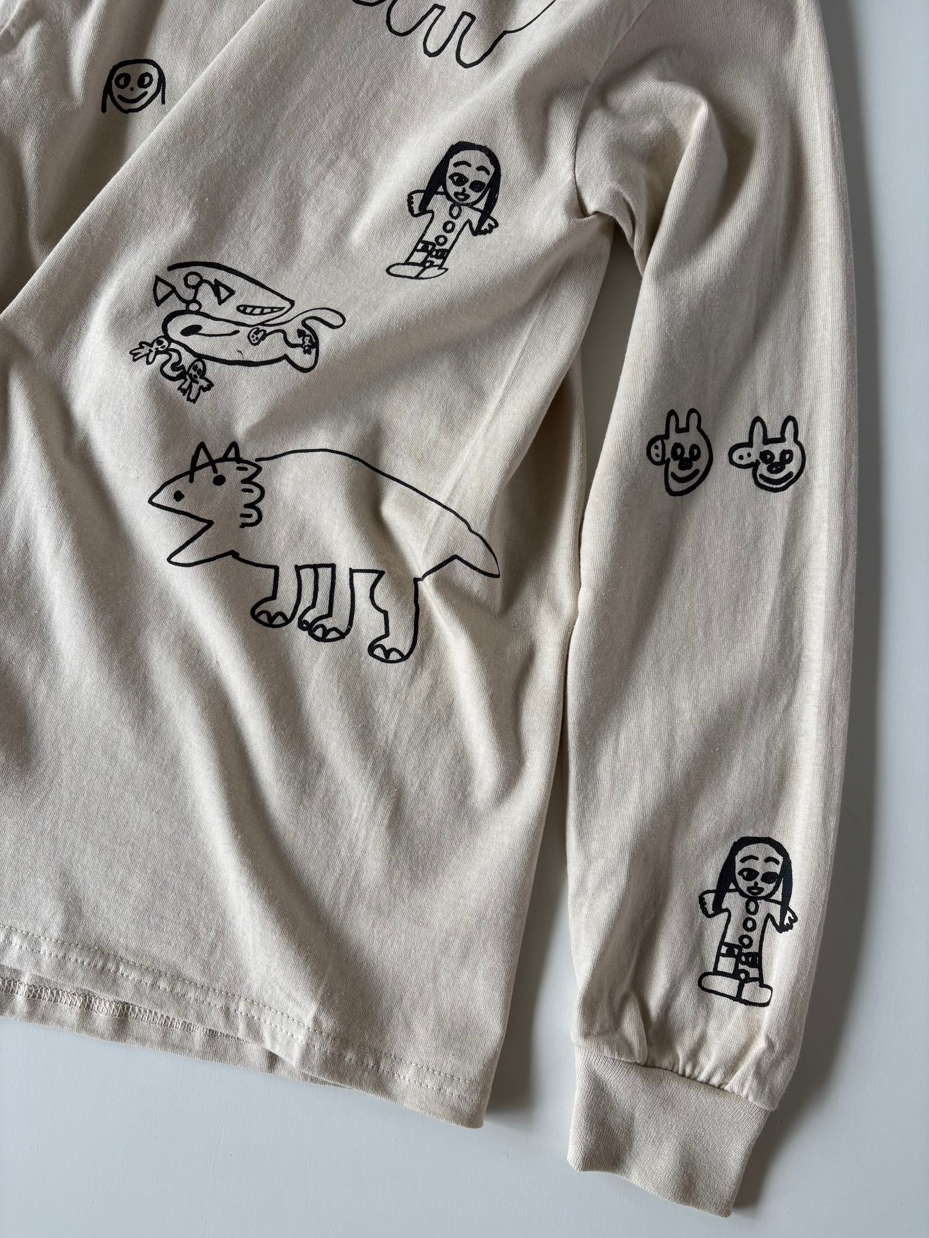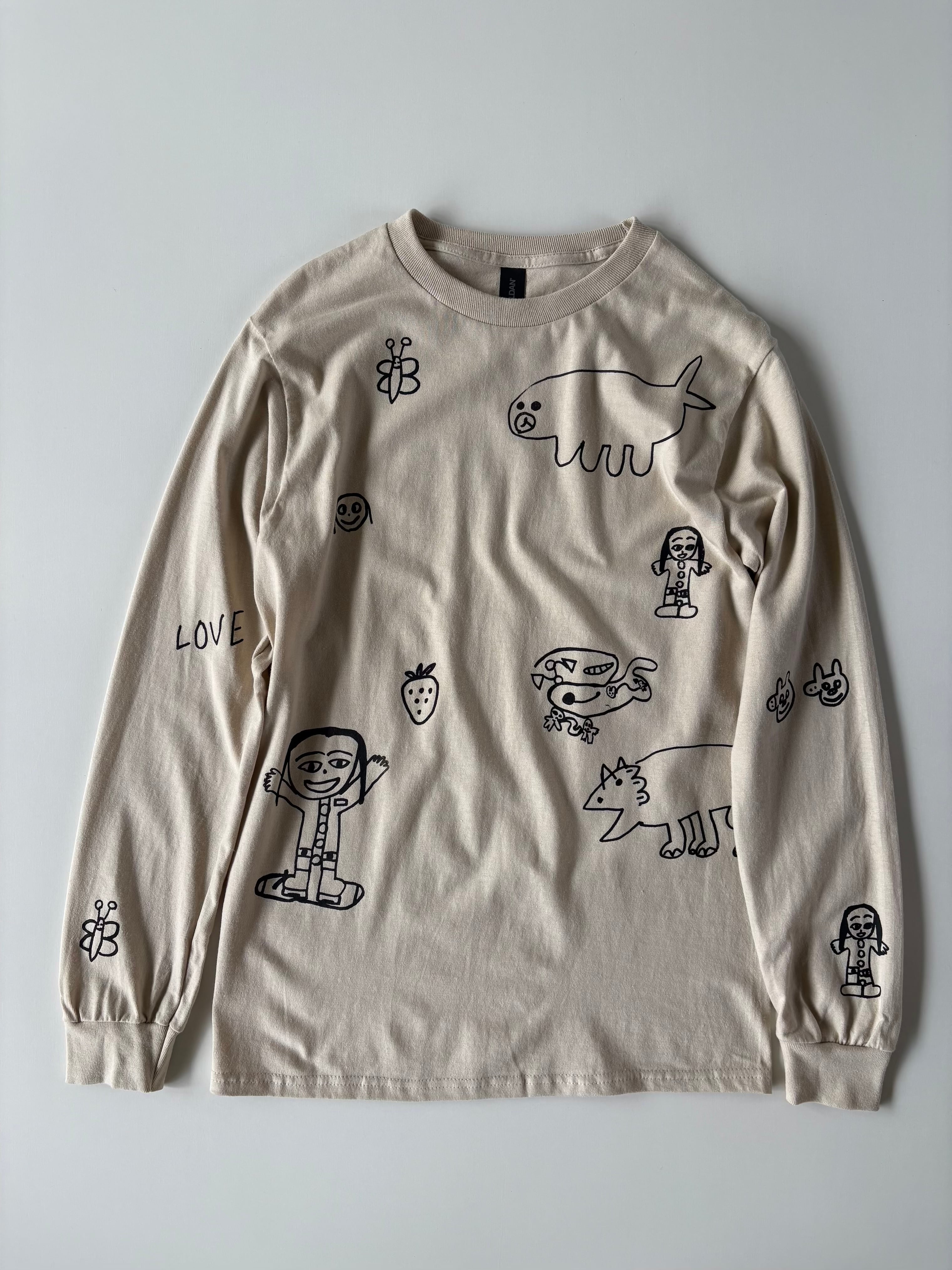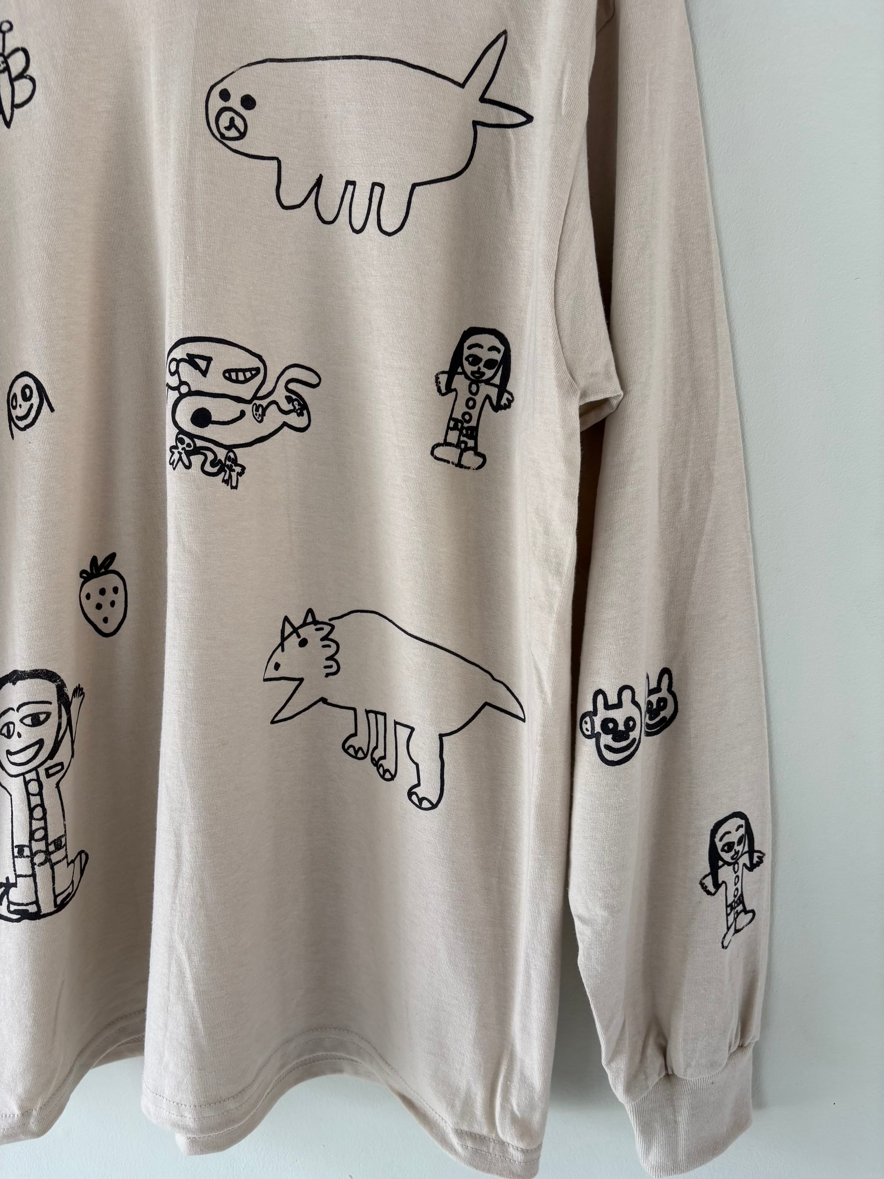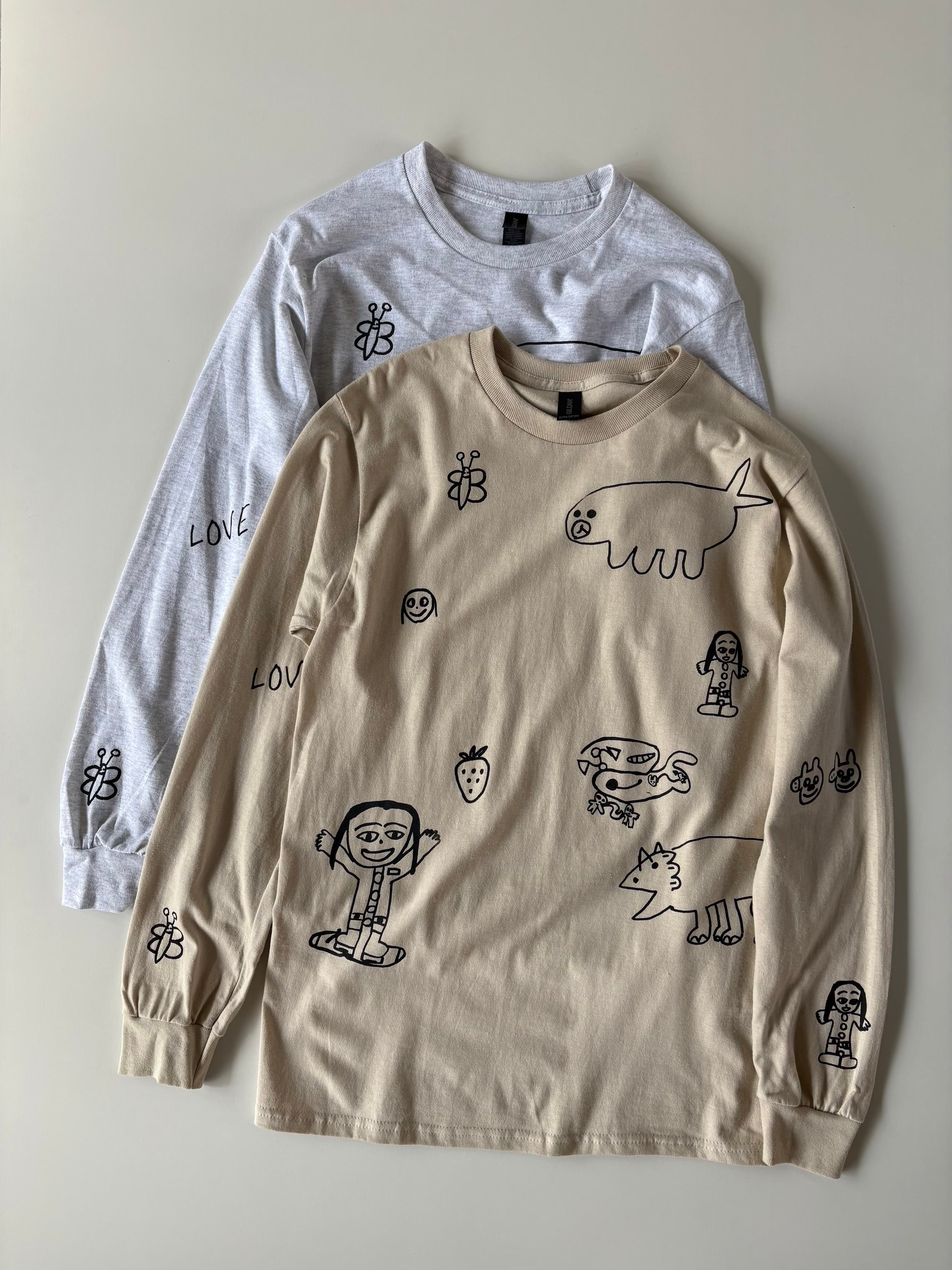 当店 長女と次女の手描きデザインで 一枚一枚小さなシルクスクリーンの版を製作しプリントしたオリジナルのロンTです。
