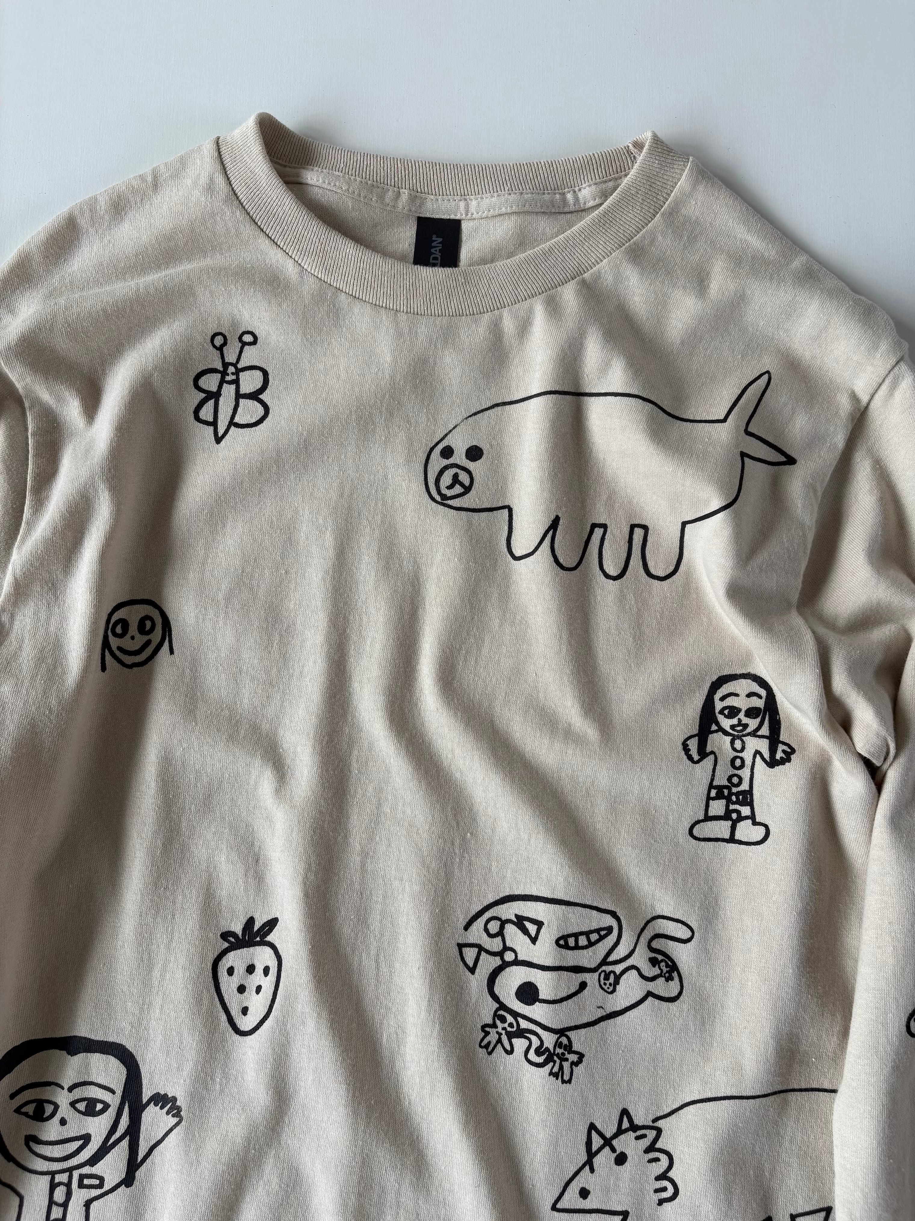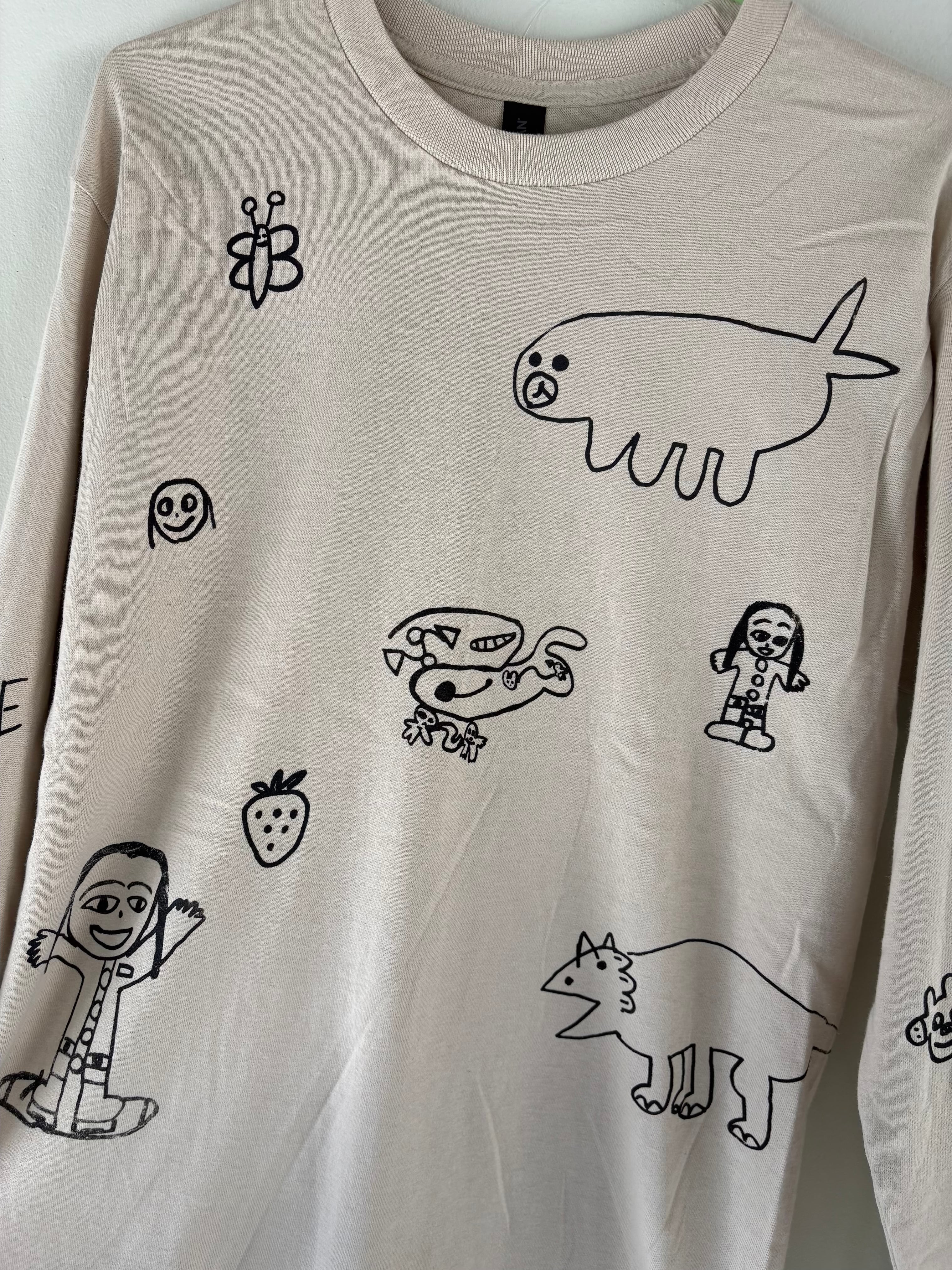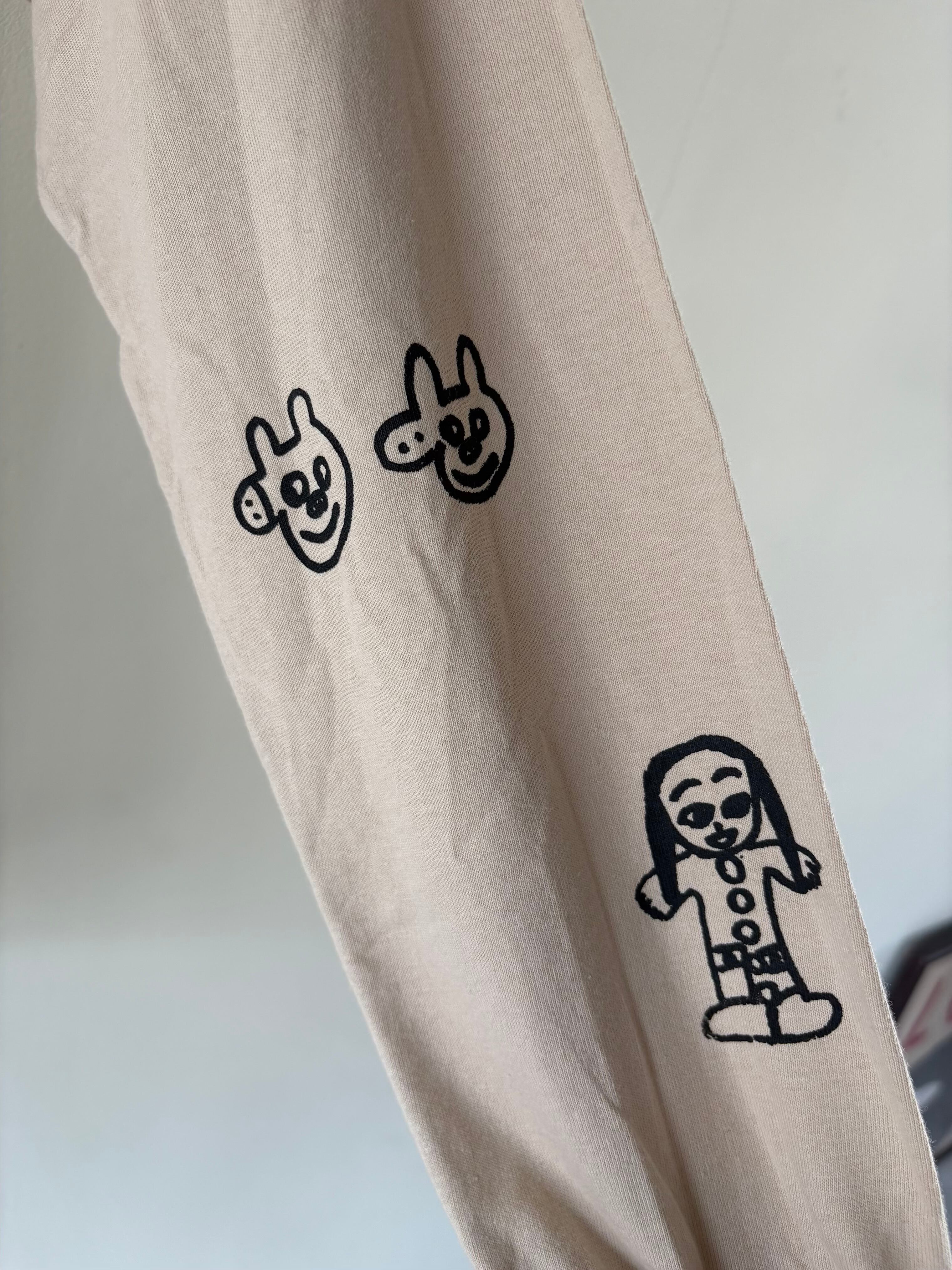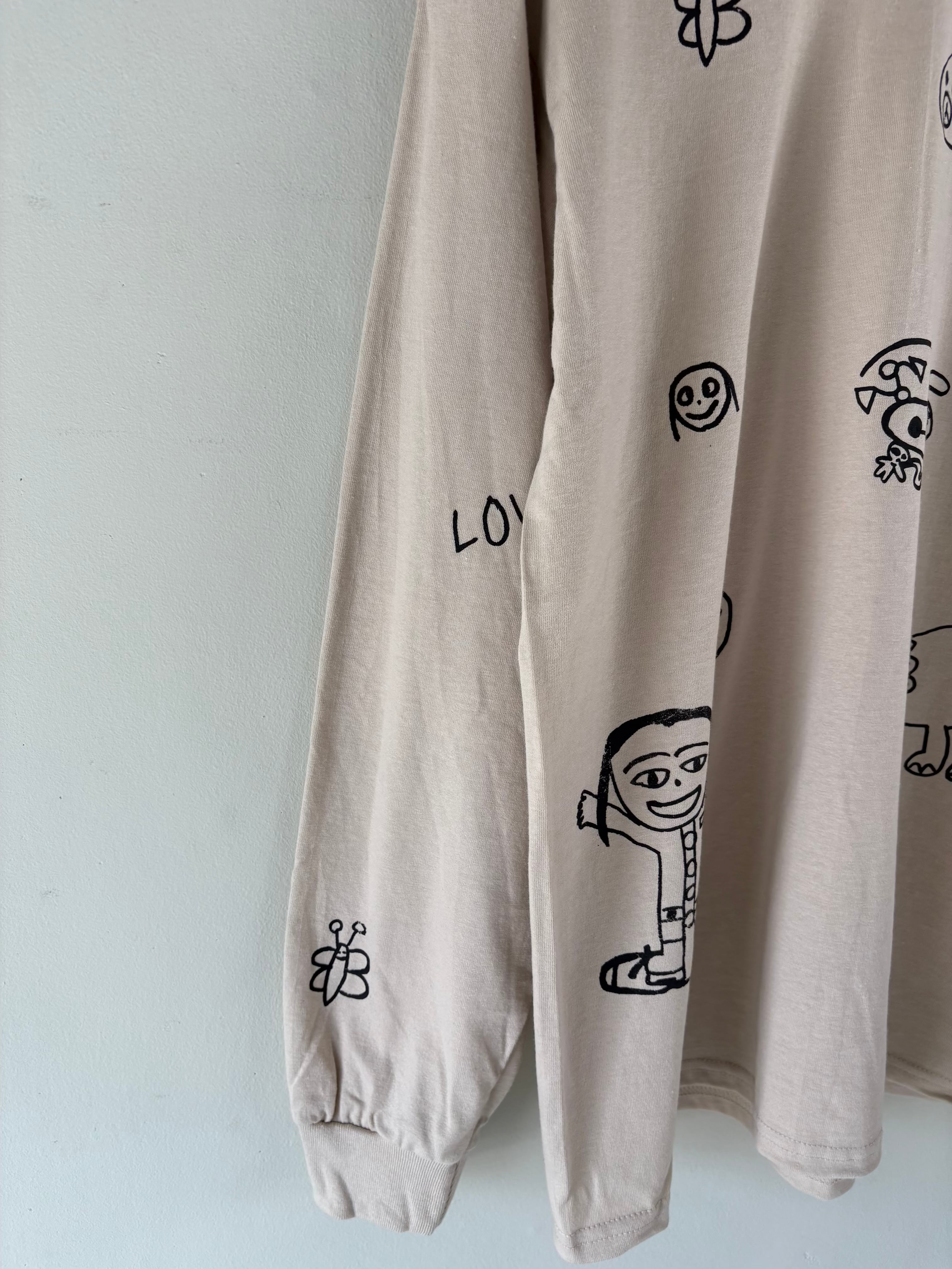 当店 長女と次女の手描きデザインで 一枚一枚小さなシルクスクリーンの版を製作しプリントしたオリジナルのロンTです。