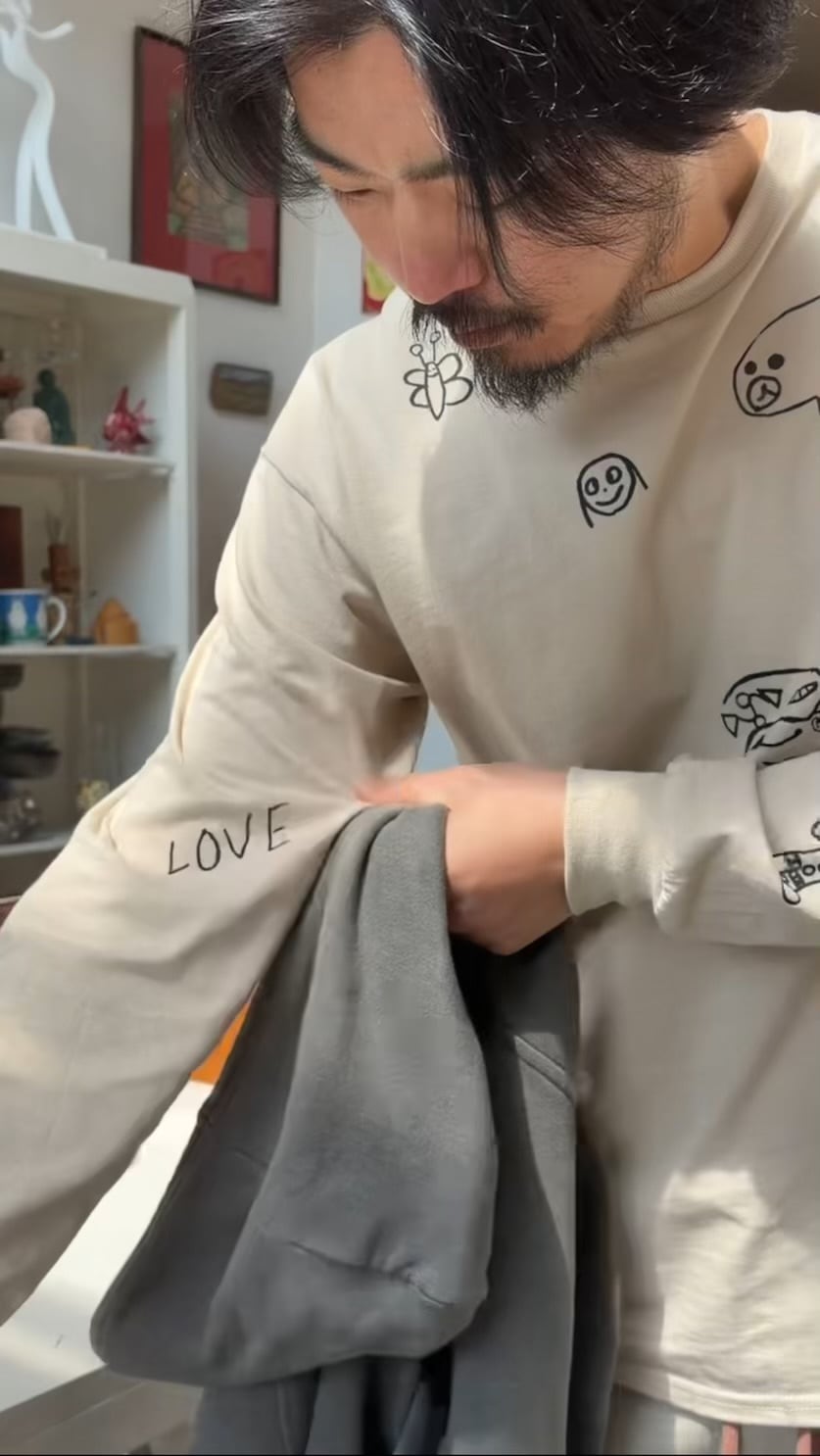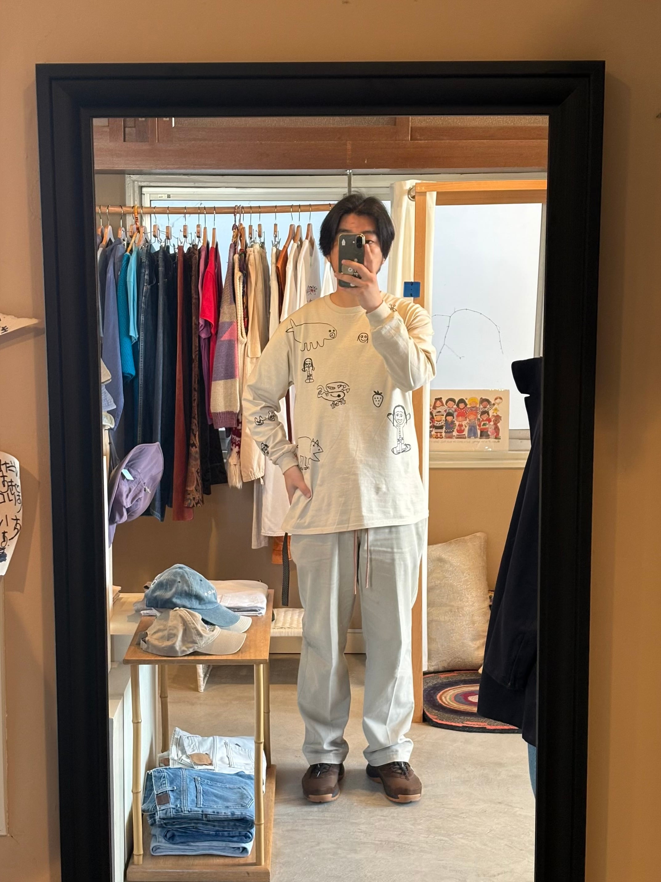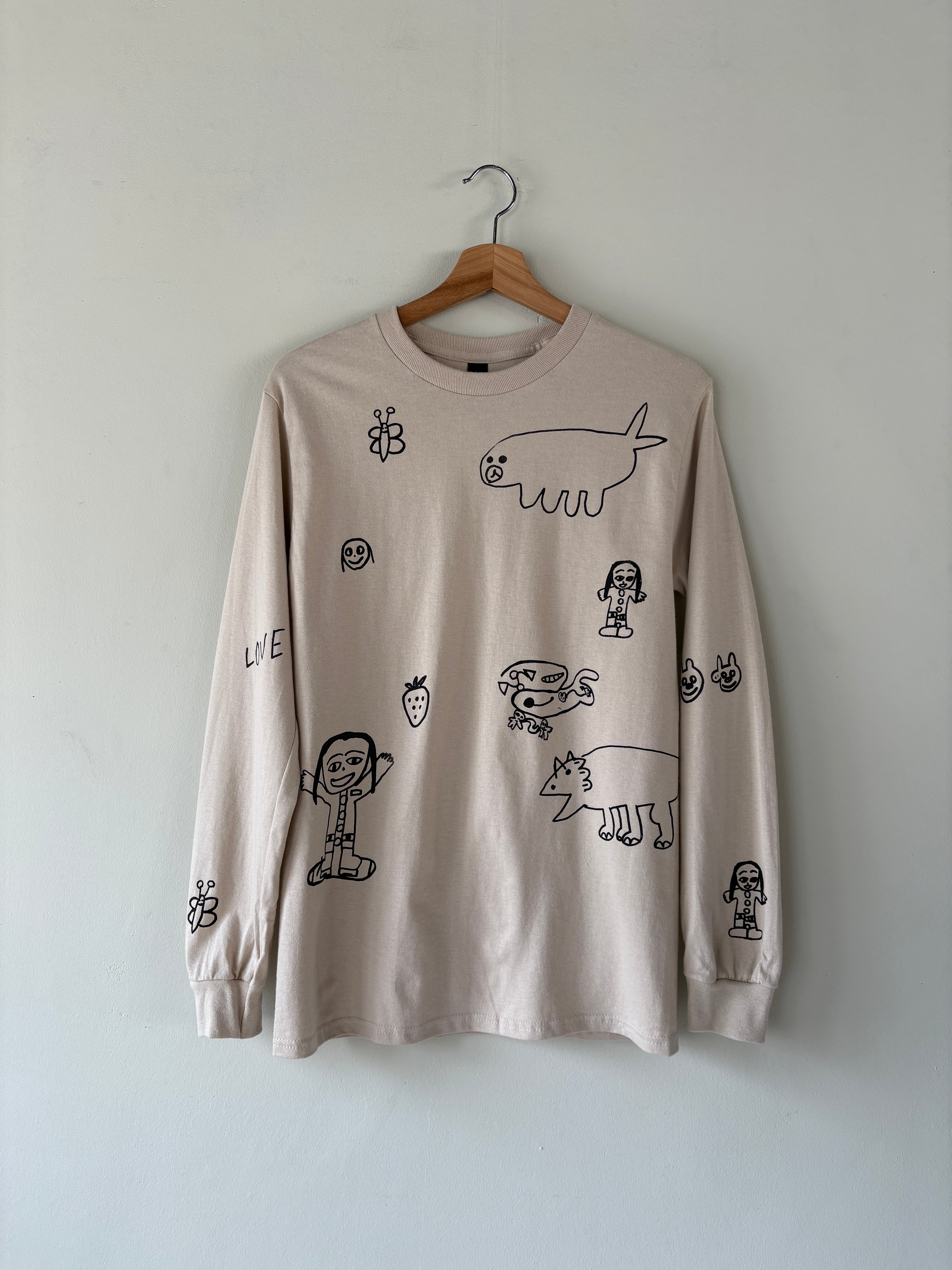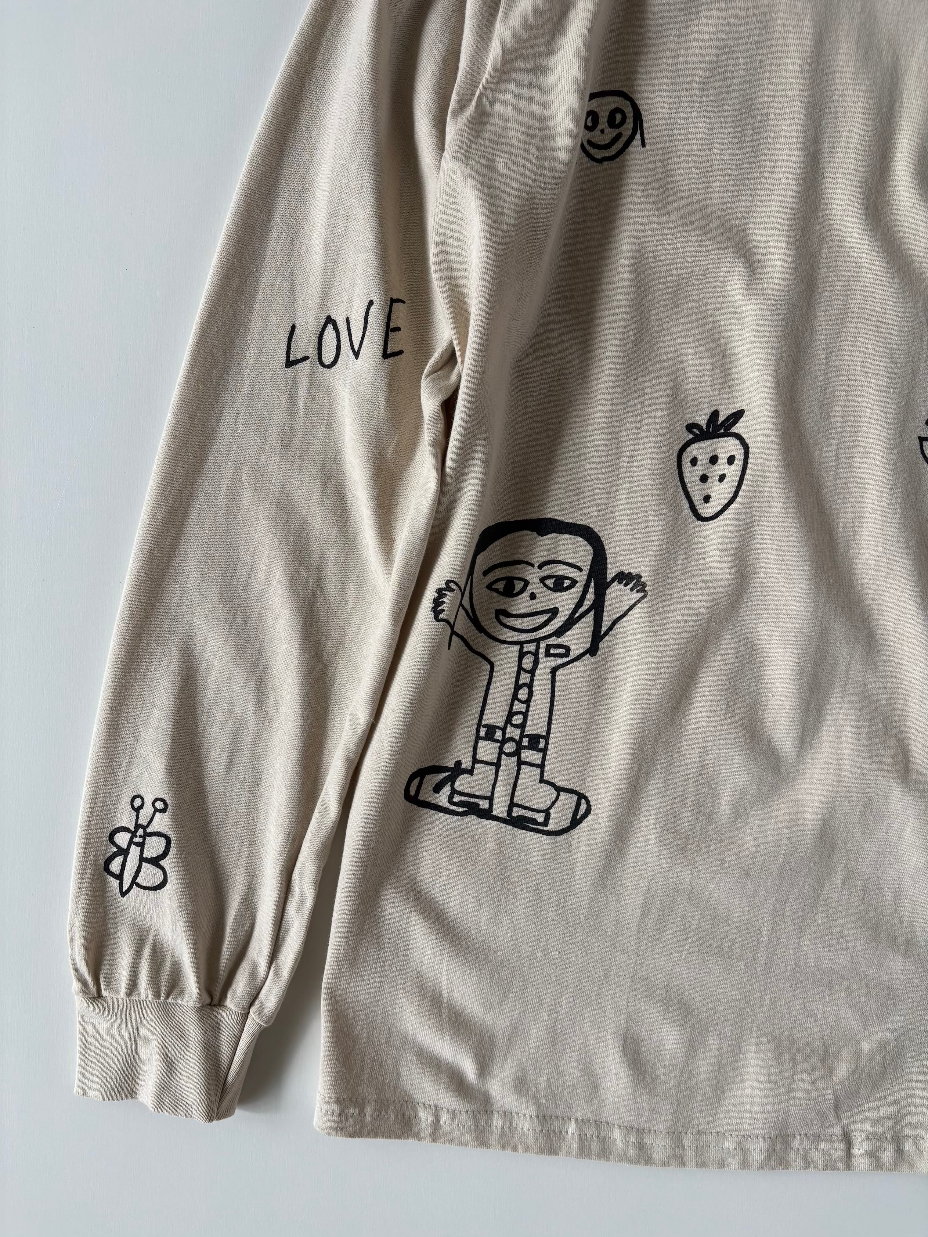 当店 長女と次女の手描きデザインで 一枚一枚小さなシルクスクリーンの版を製作しプリントしたオリジナルのロンTです。
