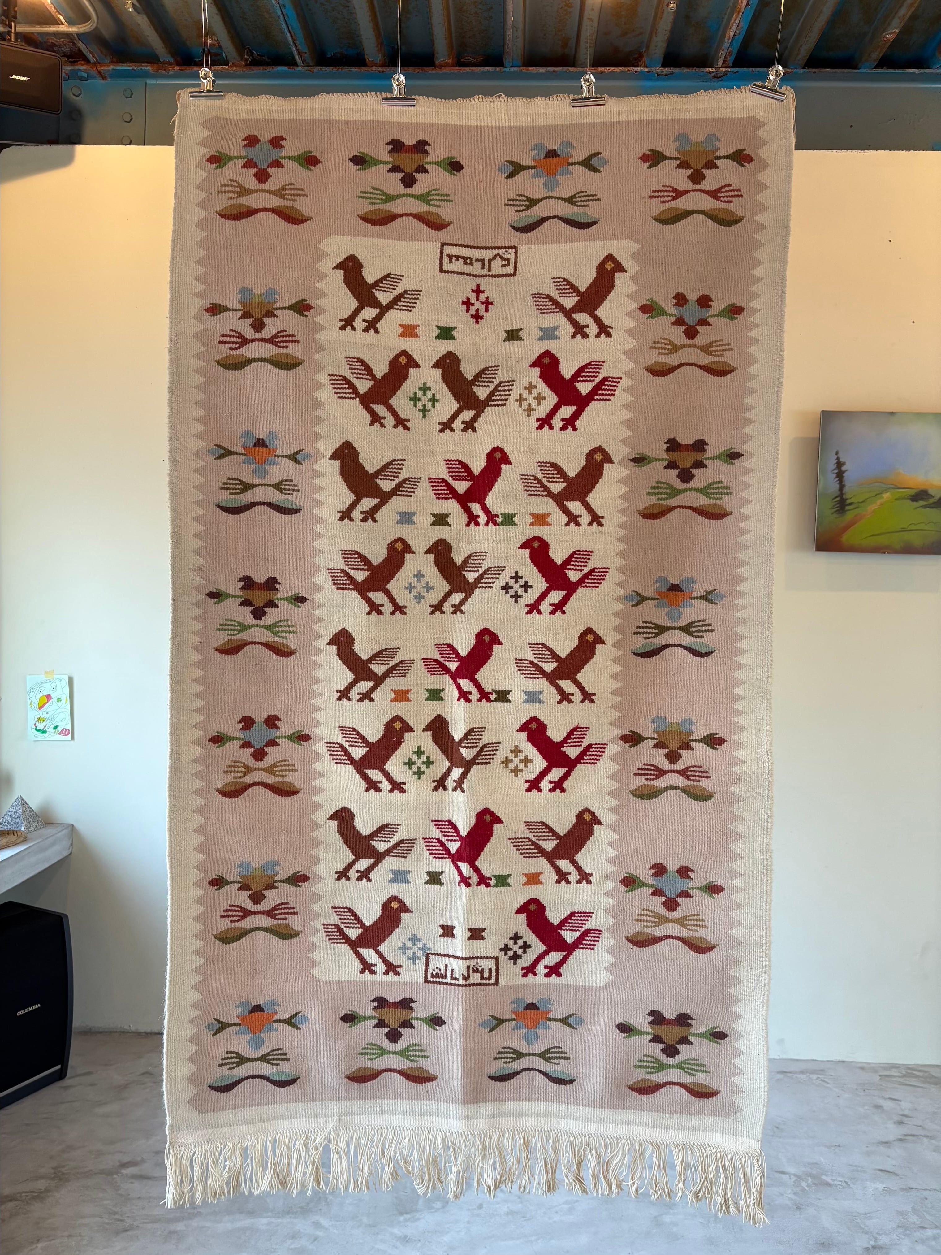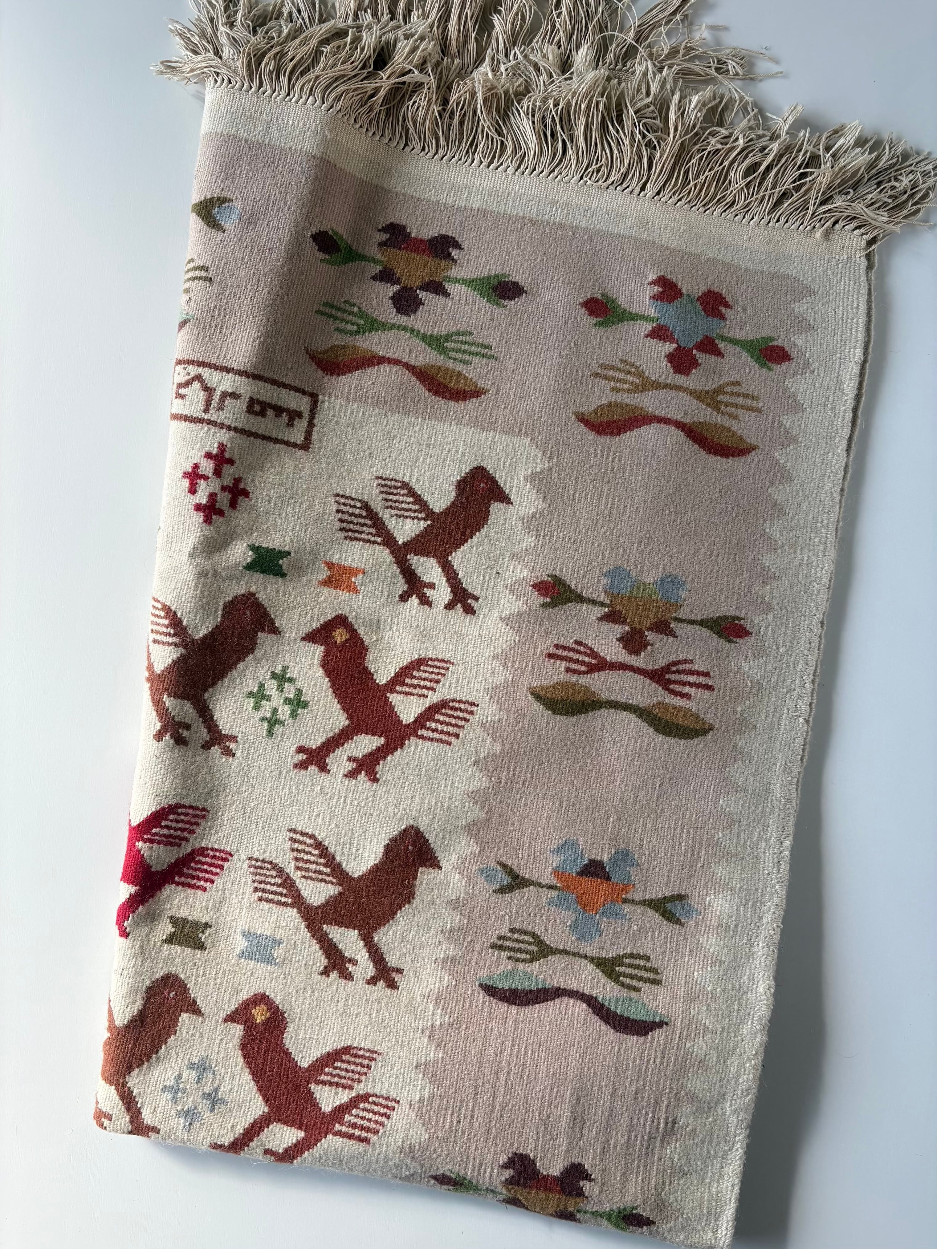 中でもこちらは鳥や植物などのモチーフが 綺麗な色合いで織り込まれた デザイン、雰囲気の良さが魅力的な一枚です。