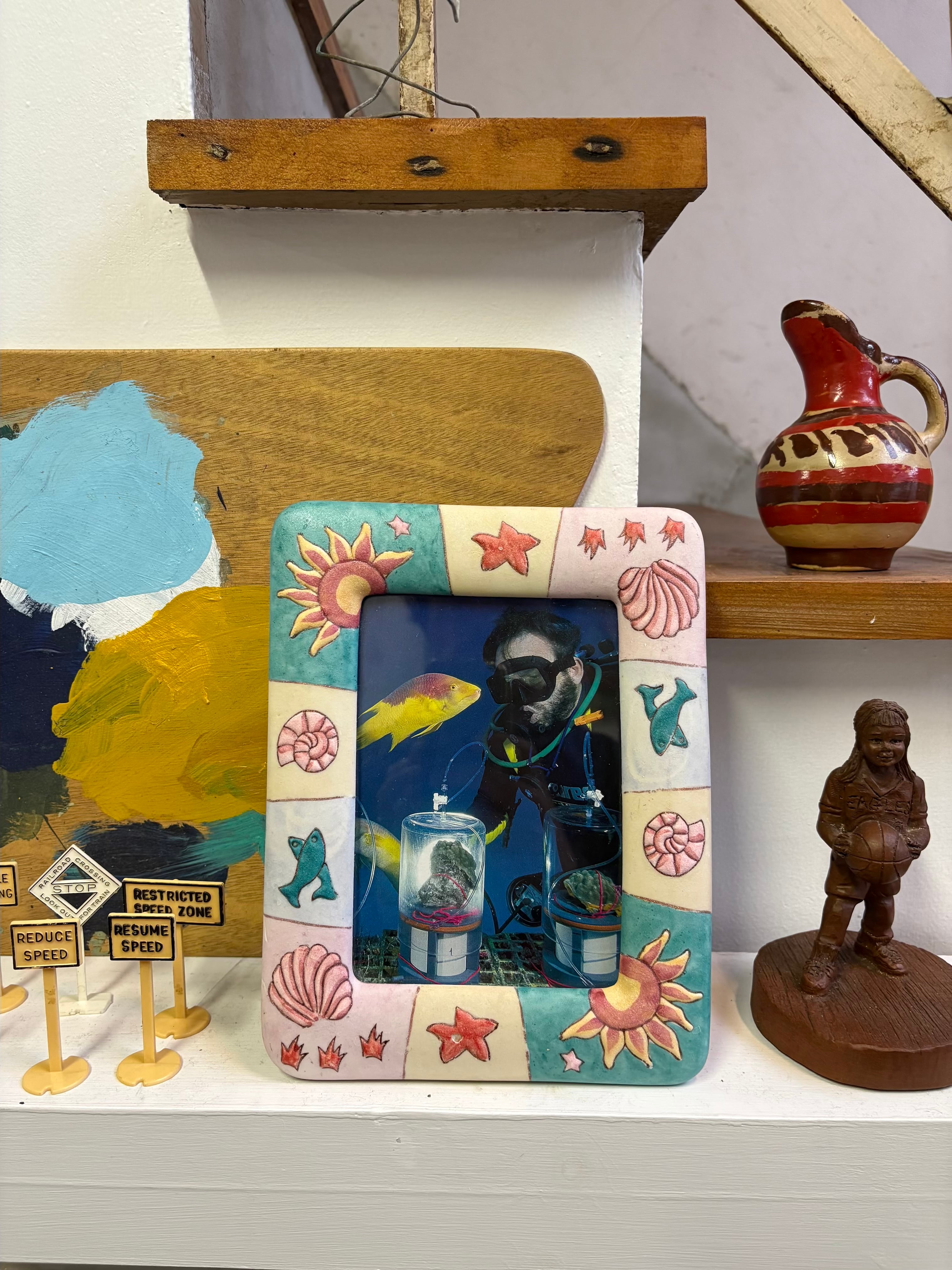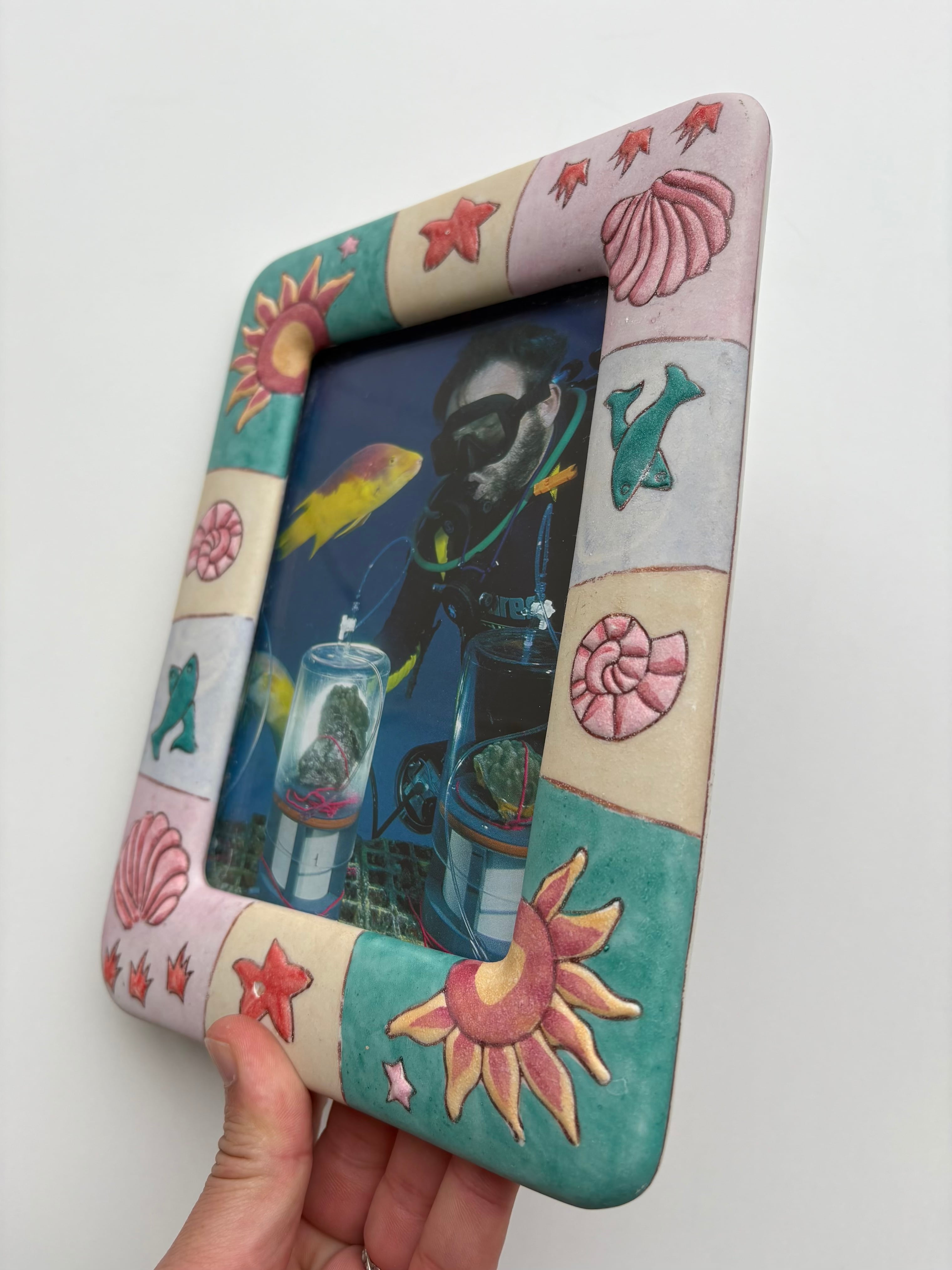 細かな装飾のフレームは陶器製で、ズッシリと重みがあります。