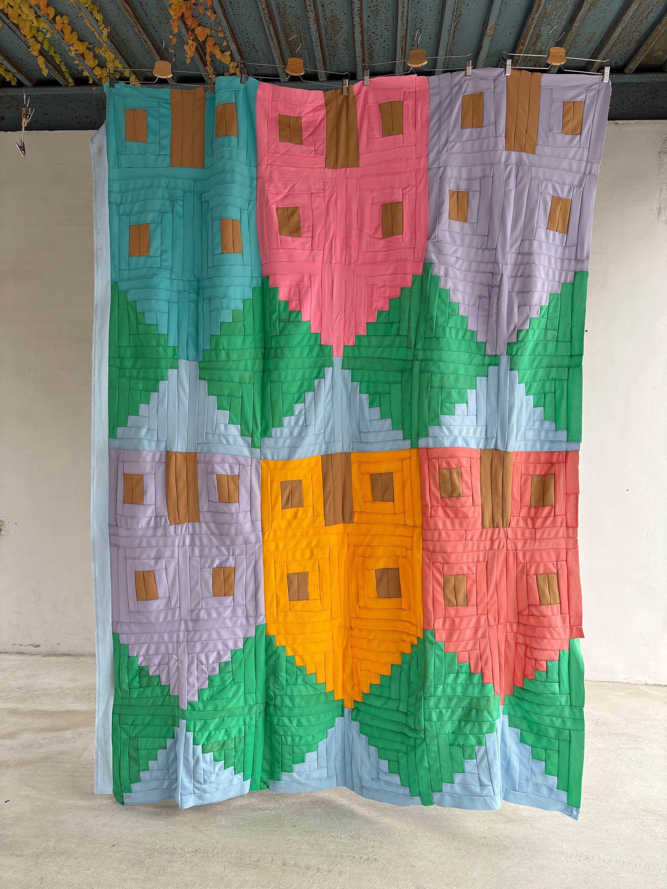 配色、デザインが作品要素が高く 中綿の入っていない薄手の生地なので カバーやタペストリーなどの室内装飾にお勧めです。